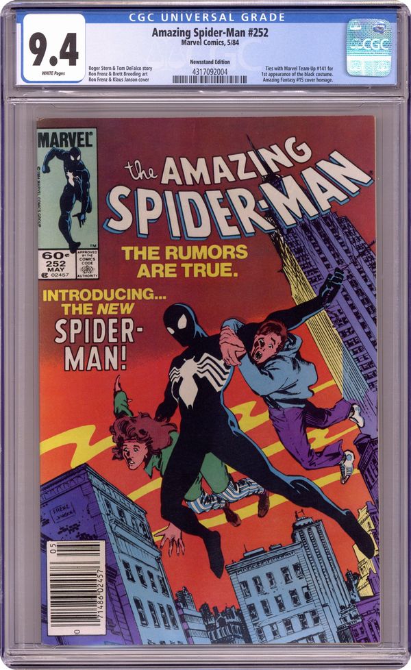 Ended Feb 6 2024 Winning Bid $305 Newsstand Edition. First appearance of Spider-Man's new black (alien symbiote) costume in "Homecoming!" Plot by Roger Stern. Script by Tom DeFalco. Pencils by Ron Frenz (breakdowns) and Brett Breeding (finishes). Cover by Ron Frenz and Klaus Janson. One of the landmark issues of the Amazing Spider-Man! With a brilliant flash of light in Central Park, the wondrous wall-crawler is back! And he looks a whole lot different! Wow, a new costume! What happened during the Secret Wars on the Beyonder's world? The ominous truth will be revealed to both the readers and the web-slinger in the days and weeks ahead! Cameo appearances by the Black Cat, Dr. Curt Connors, J. Jonah Jameson, Joe Robertson , Aunt May, Captain America, Captain Marvel, Hawkeye, Iron Man, Thor, and the Wasp. (Notes: Marvel Age 12 contained sketches of the new costume two months prior to the publication of this issue. Spidey's new costume was also unveiled in Marvel Team-Up 141 and Spectacular Spider-Man 90. The first issue of the (1984) Marvel Super Heroes Secret Wars Limited Series was published the same month as Amazing Spider-Man 252. The web-slinger discovers his new costume in issue 8 of the limited series. The Frenz-Janson cover is a tribute to the iconic cover of Amazing Fantasy 15. This story was reprinted in Marvel Tales 266. The letters page contains a statement of ownership: average print run 470,527; average paid circulation: 241,762. 36 pgs. Cover price $0.60. Grade: CGC 9.4 explanation of grade Condition: Used (collectible)