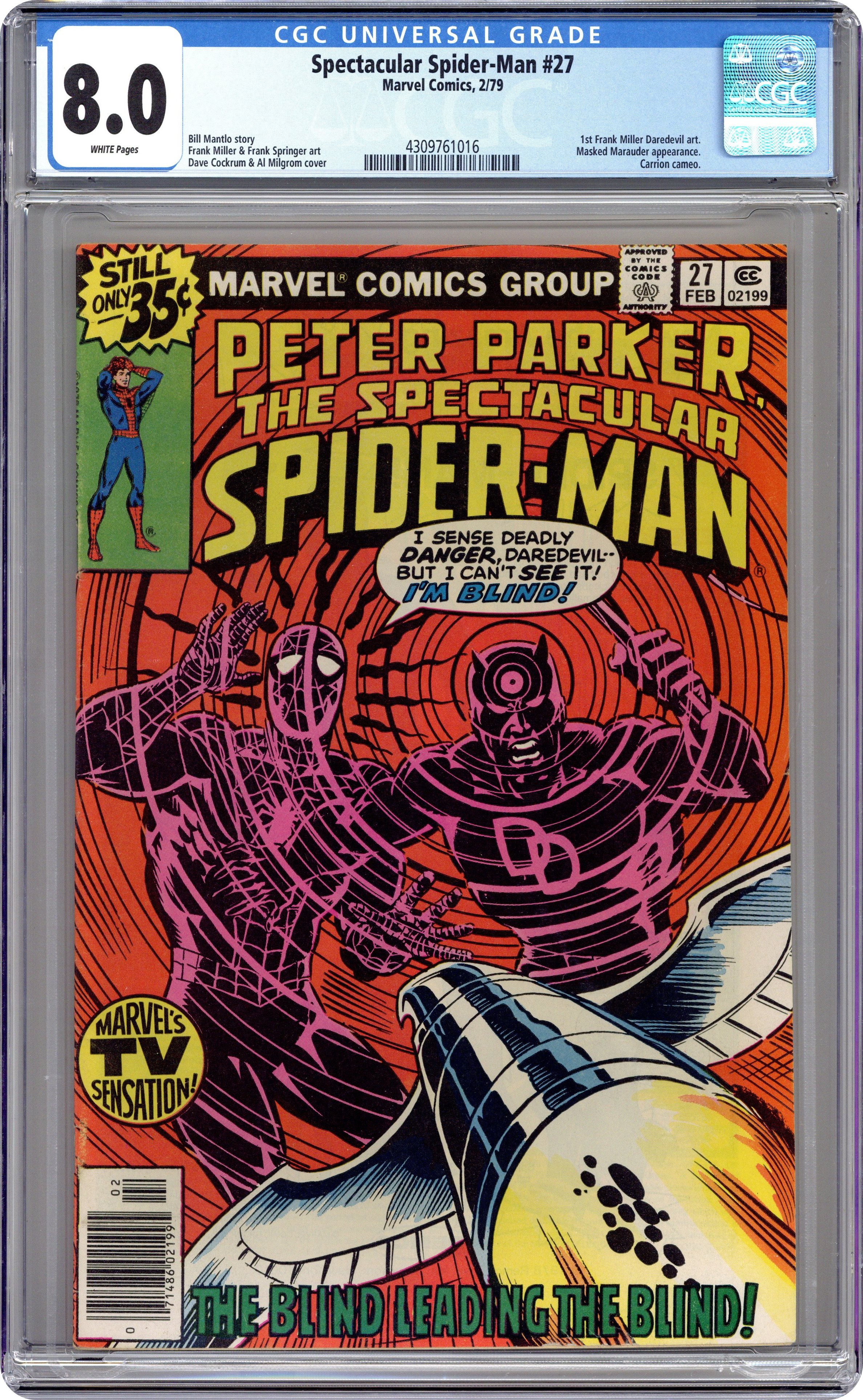 Ended Dec 12 2023 Winning Bid $29 1st Printing. "The Blind Leading The Blind" Guest-starring Daredevil. Script by Bill Mantlo. Pencils by Frank Miller (1st work on Daredevil). Inks by Frank Springer. Cover by Dave Cockrum and Al Milgrom. One of the classic issues of the bronze age. Two blind super-heroes are on the trail of the Masked Marauder and the Tri-Man! Can Daredevil lead Spider-Man to the secret lair of the Maggia? The Man Without Fear and the web-slinger must hurry, because the Masked Marauder is set to launch his atomic bombdroid to destroy the city! Cameo appearances by Mary Jane Watson and Carrion. (Notes: This issue includes a one-page retelling of Daredevil's origin. This issue was reprinted in 1984 in Spider-Man and Daredevil 1, in 1993 through JC Penney Catalog identifiable by having the words "The Amazing Spider-Man" printed in the UPC box, and again in 1994 in The Complete Frank Miller Spider-Man). 36 pages Cover price $0.35. Grade: CGC 8.0 explanation of grade Condition: Used (collectible)