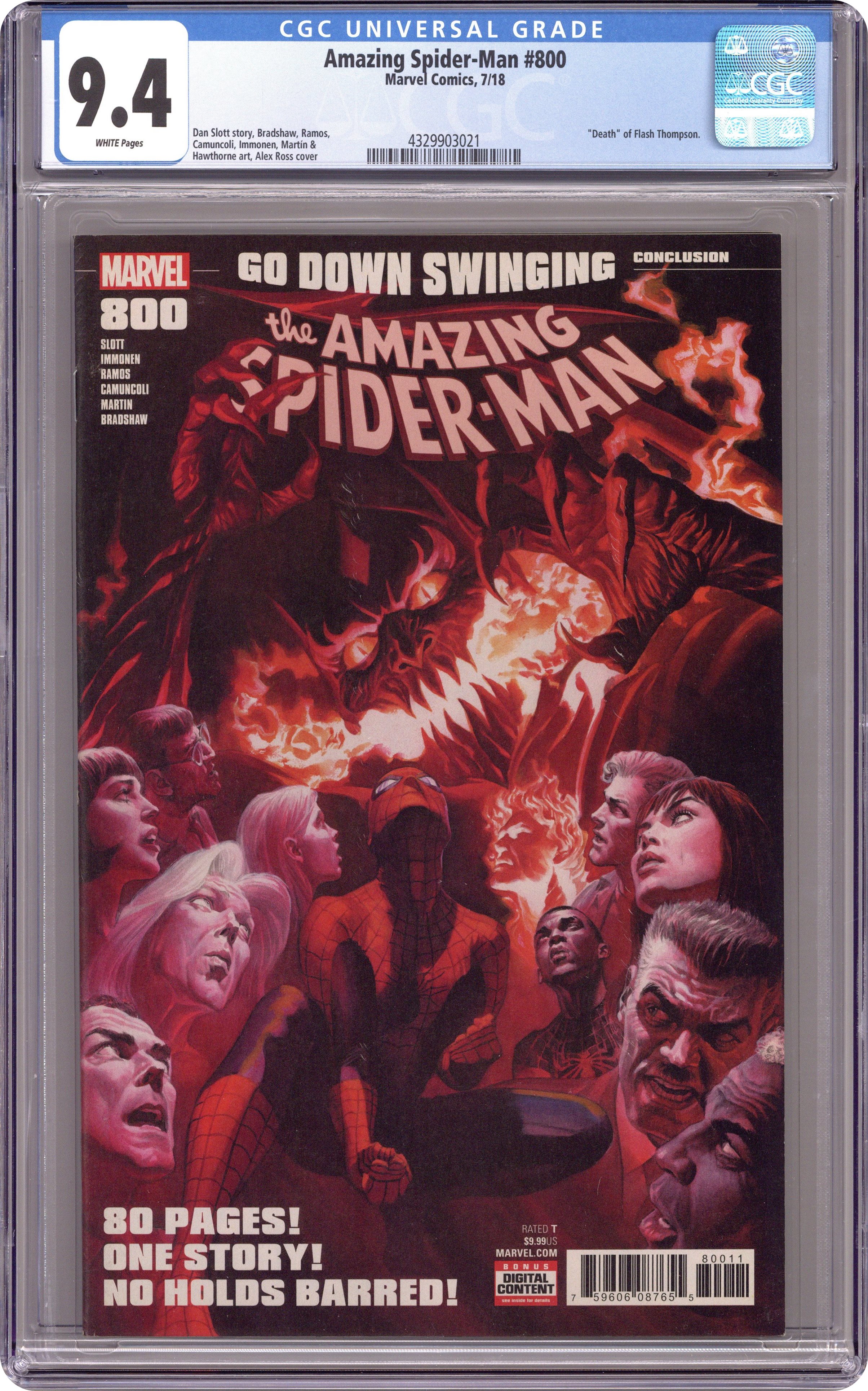 Ended Dec 12 2023 Winning Bid $18 Go Down Swinging: Part 4 of 4 - Written by Dan Slott. Art by Nick Bradshaw, Humberto Ramos, Guiseppe Camuconli, Stuart Immonen, Marcos Martin, Victor Olazaba, Cam Smith and Wade Von Grawbadger. Cover by Alex Ross. Dan Slott and Stuart Immomen are joined by many of the artists who made the last 10 years of Spider-Man so Amazing! The biggest Peter Parker/Norman Osborn story of all time unfolds over one 80-page story, a scope unmatched in comics! Who lives?! Who dies?! And what scars will Spider-Man bear from here on out?! 92 pages,full color. Rated T Cover price $9.99. Grade: CGC 9.4 explanation of grade Condition: Used (collectible)
