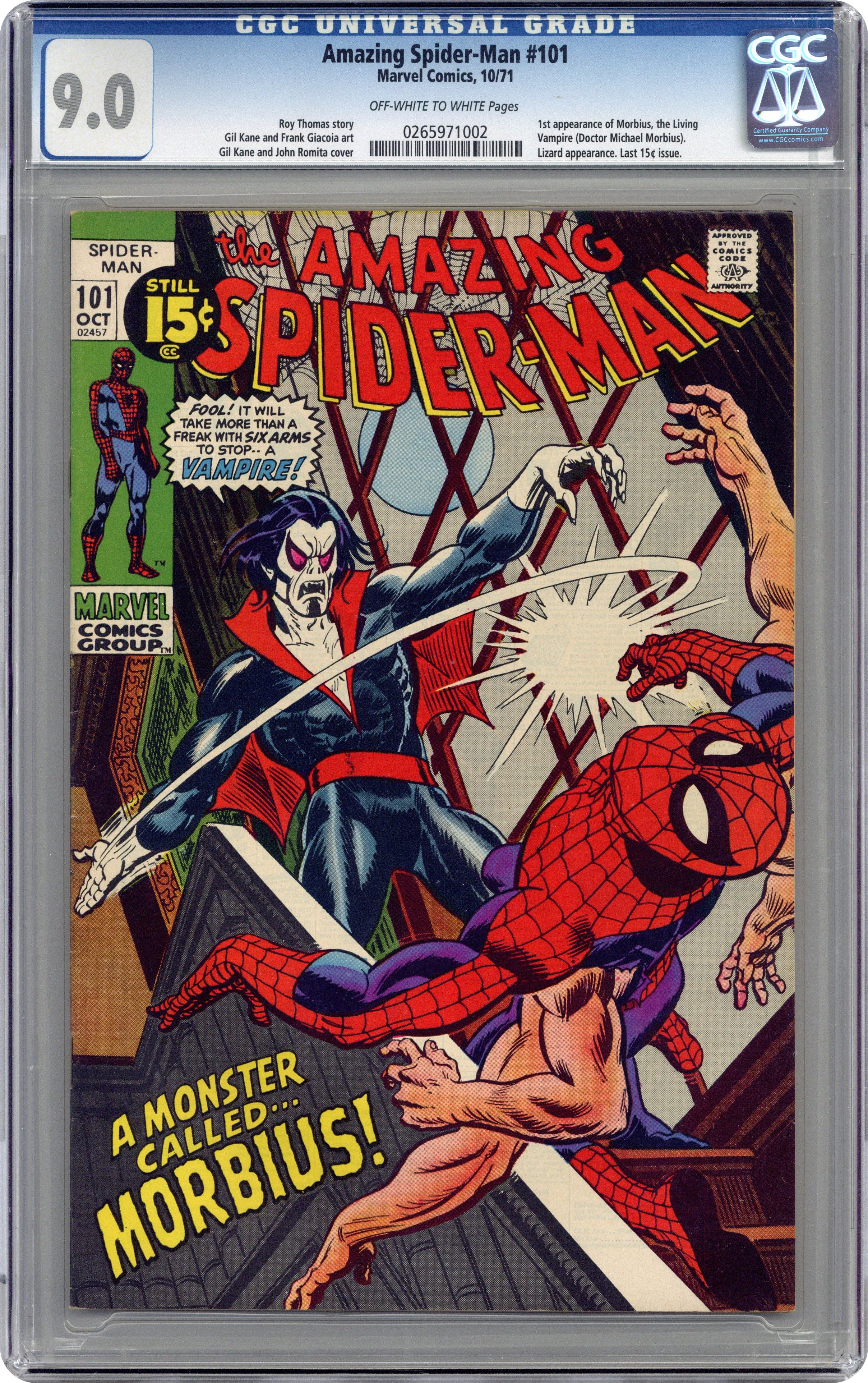 First appearance of Morbius the Living Vampire in "A Monster Called Morbius!" Script by Roy Thomas. Pencils by Gil Kane. Inks by Frank Giacoia. Cover by Gil Kane and John Romita. The first 100 issues of the Amazing Spider-Man title are in the books! And the next chapter in the web-slinger's anthology kicks off with the debut of Marvel's first bronze age vampire: Morbius! However, at the moment Peter Parker has a much bigger problem on his (six) hands. After drinking the special potion he developed, Aunt May's nephew grew four additional arms! Oh, my goodness! Peter is desperate to find a way to remove the arms, so he calls Dr. Curt Connors for help. Dr. Connors has a summer house and laboratory in Southampton on Long Island...and he gives Spider-Man permission to stay there and work on a cure. Meanwhile, a strange, pale, and bloodthirsty man is the sole survivor of a shipwreck near Southampton. And he's looking for a quiet place to rest. Oh no. Is the six-armed Spider-Man on a collision course with a living vampire? Oh yes! Cameo appearances by Gwen Stacy, J. Jonah Jameson, Joe Robertson, and the Lizard. Last 15ยข cover price. (Notes: This is the first issue of the Amazing Spider-Man series not written by Stan Lee. There exists a second printing of this issue published in 1992 with a silver background cover. Marvel also published a facsimile edition of Amazing Spider-Man 101 in 2021.) 36 pages. Cover price $0.15. Grade: CGC 9.0 explanation of grade Condition: Used (collectible)