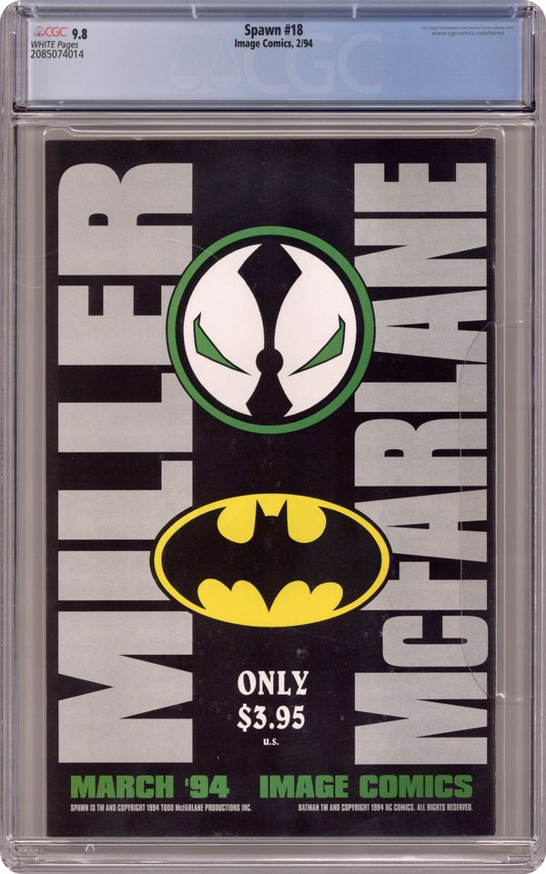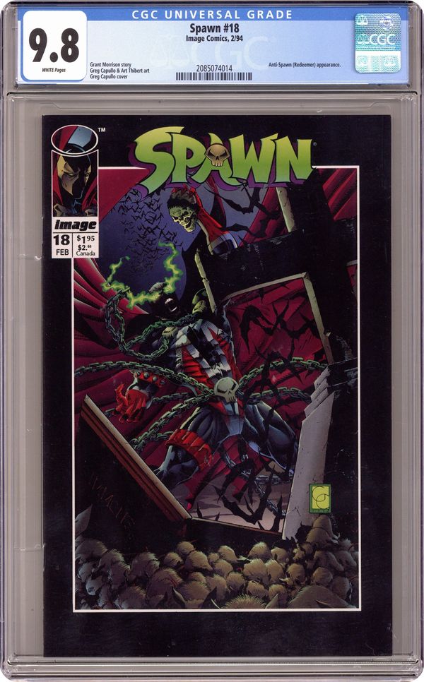 "Reflections!" Part 3 of 3. Story by Grant Morrison. Art by Greg Capullo, Dan Panosian, and Art Thibert. Don't miss the epic conclusion to Spawn's battle with his greatest adversary to date, the Anti-Spawn. Plus, Al finally decides to let Wanda go and embrace his new life as a dark avenger. Includes 2 Spawn pin-ups. Cover price $1.95. Grade: CGC 9.8 explanation of grade Condition: Used (collectible)