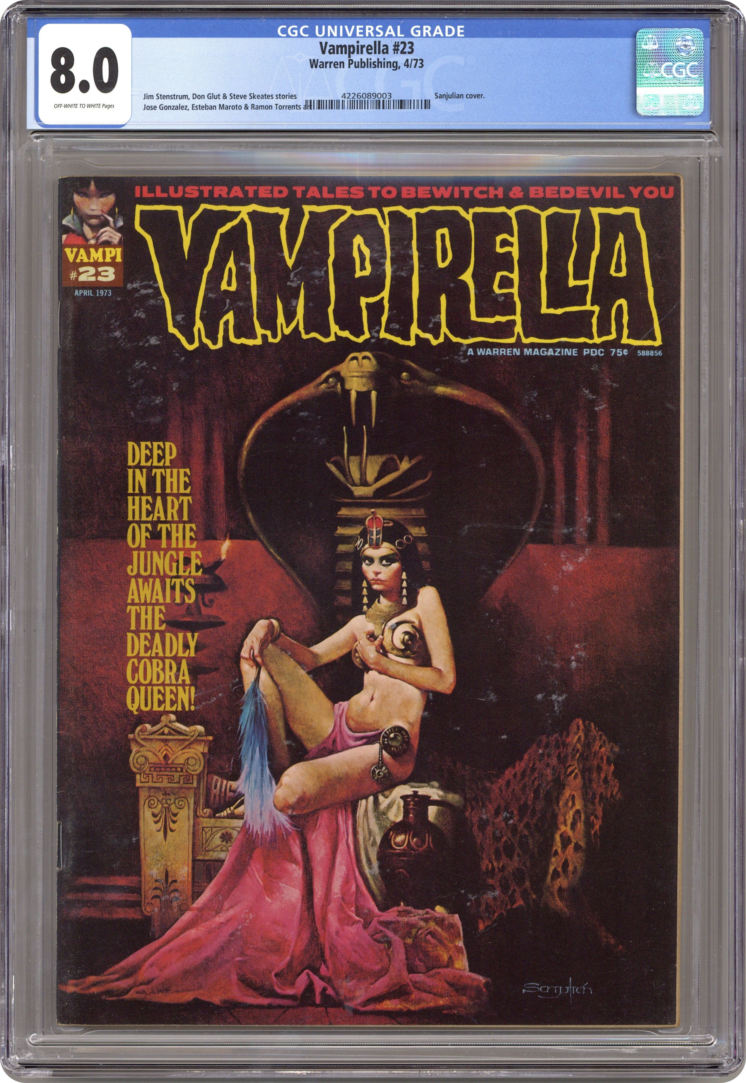 Ended Jan 2 2024 Winning Bid $42 Stories in this issue include: "Queen of Bayou Parish" (starring Vampirella); "Cobra Queen"; "Call it Companionship"; "The Accursed"; "Witch's Promise"; and "Won't Eddie Ever Learn?" Written by Gerry Boudreau, Steve Englehart, Don Glut, Kevin Pagan, Steve Skeates, and Jim Stenstrum. Art by Auraleon, Jose Bea, Jose Gonzalez, Esteban Maroto, Felix Mas, and Ramon Torrents. Cover art by Manuel Sanjulian. Cover price $0.75. Grade: CGC 8.0 explanation of grade Condition: Used (collectible)