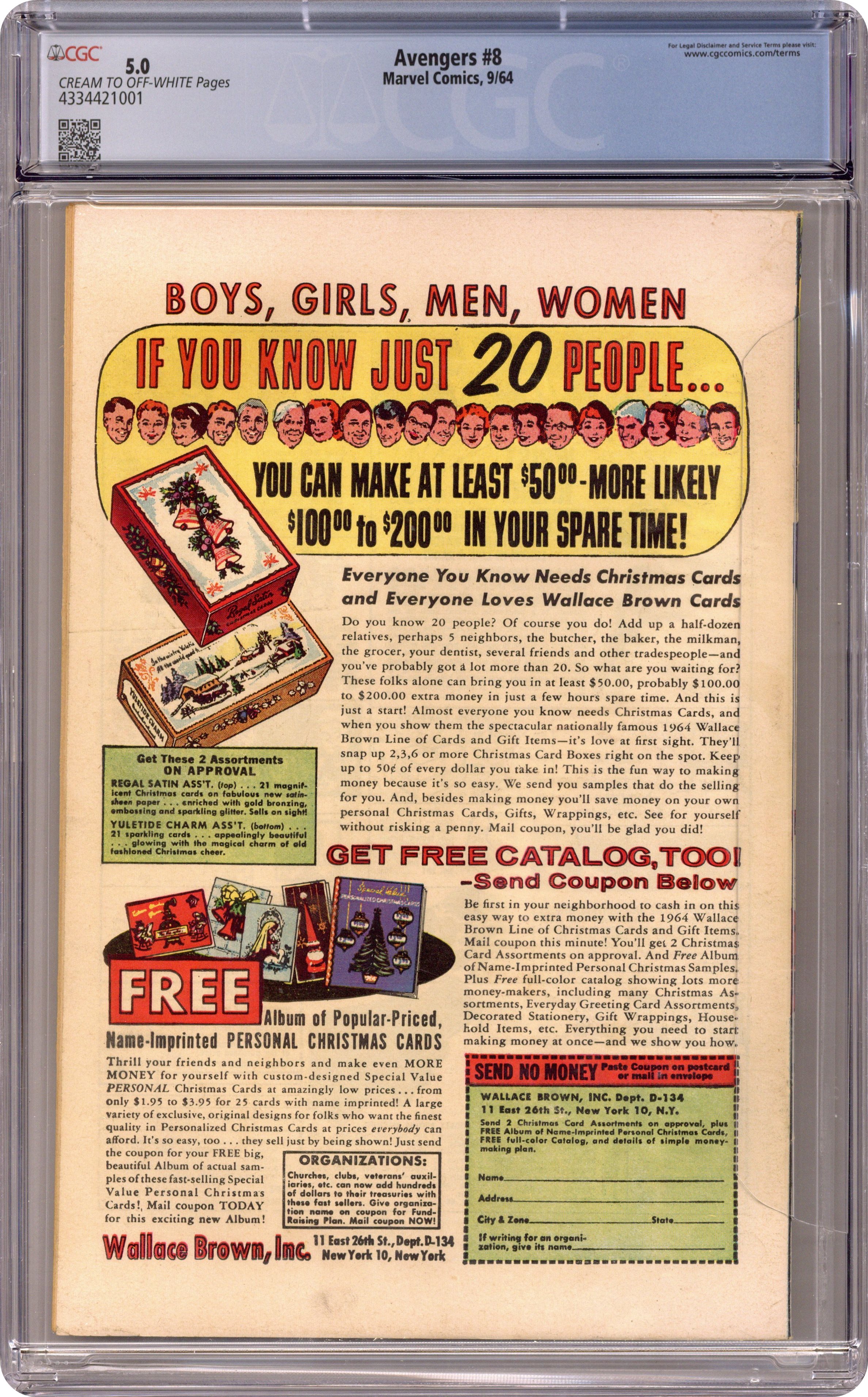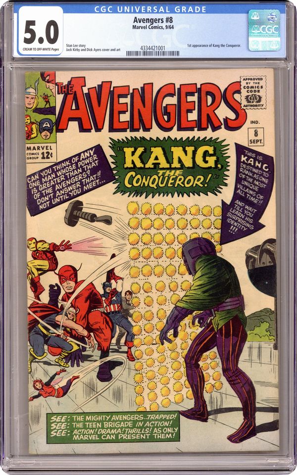 Cover pencils by Jack Kirby, inks by Dick Ayers. Kang, The Conqueror!, script by Stan Lee, pencils by Jack Kirby, inks by Vince Colletta cover; Kang appears and demands to be made ruler of the Earth; The Avengers attempt to stop him, but it comes down to Wasp and the Teen Brigade to slow Kang long enough for the rest of the Avengers to free themselves and put an end to Kang's threat. Roster: Captain America, Thor, Iron Man, Wasp, Giant-Man, and Rick Jones. First appearance of Kang. 36 pgs. $0.12. Cover price $0.12. Grade: CGC 5.0 explanation of grade Condition: Used (collectible)