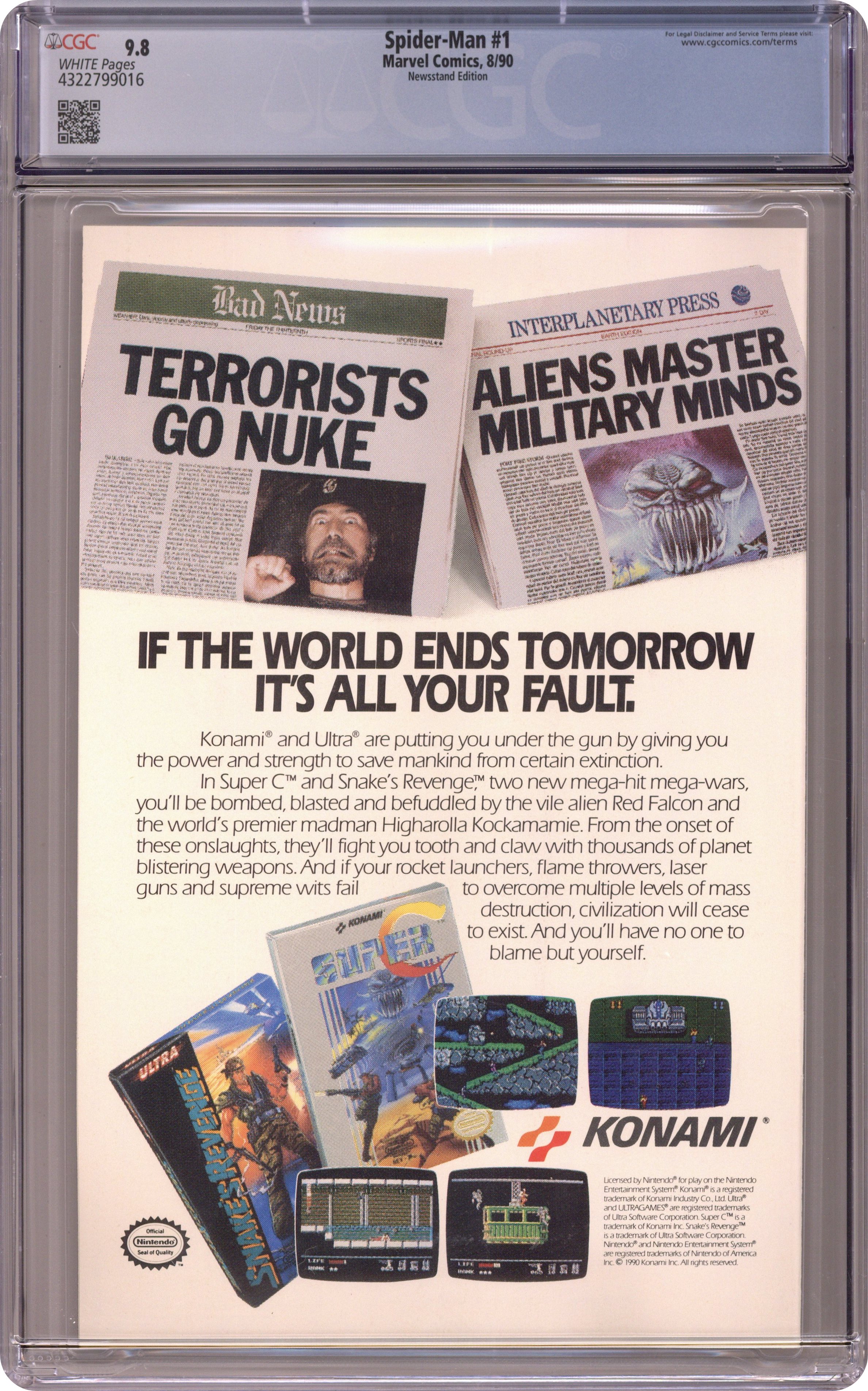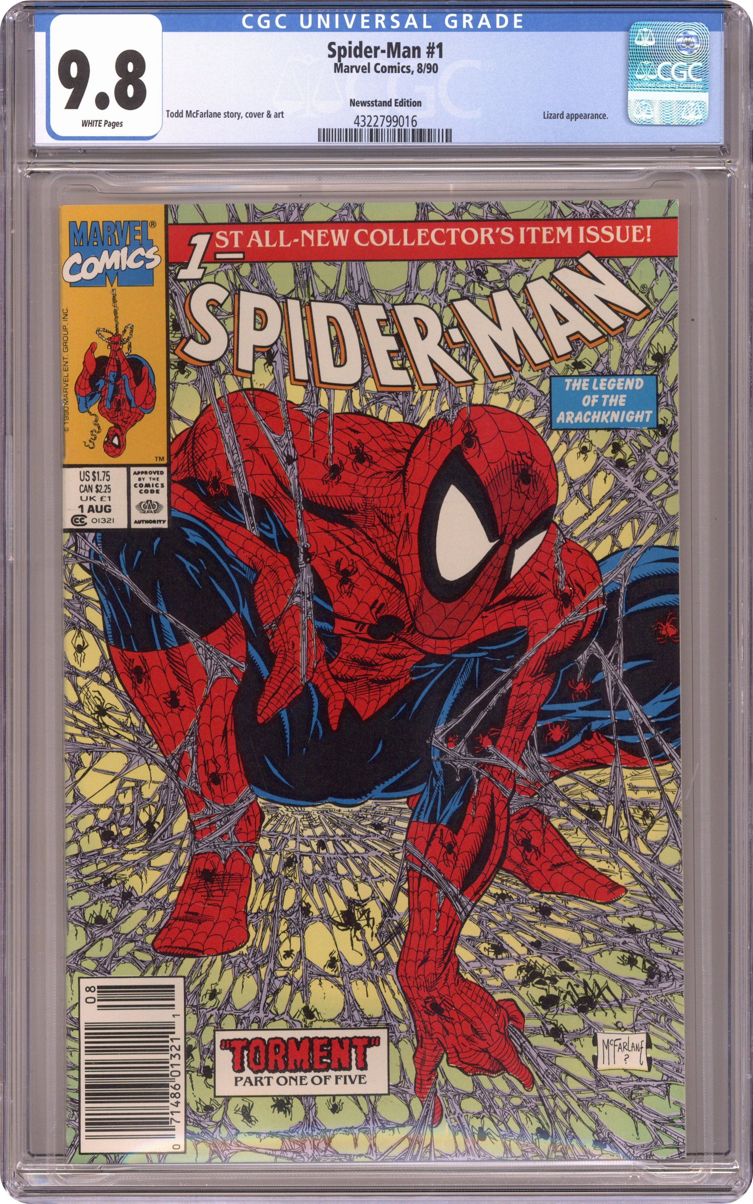 Unbagged Newsstand Edition. Torment: Part 1 of 5. Story, art and cover by Todd McFarlane. Fresh off his legendary run on Amazing Spider-Man, super-star artist Todd McFarlane is given the reigns to his very own Spidey title. Right out of the gate the wall-crawler will be challenged like never before as mysterious and ominous drums in the distance are driving the savage Lizard to cut a swath of death and destruction through the streets of New York City. Can Spider-Man discover the one responsible for this madness before his arch foe causes more damage? NOTE: Webbing on cover may be grey or purple. Cover price $1.75. Grade: CGC 9.8 explanation of grade Condition: Used (collectible)
