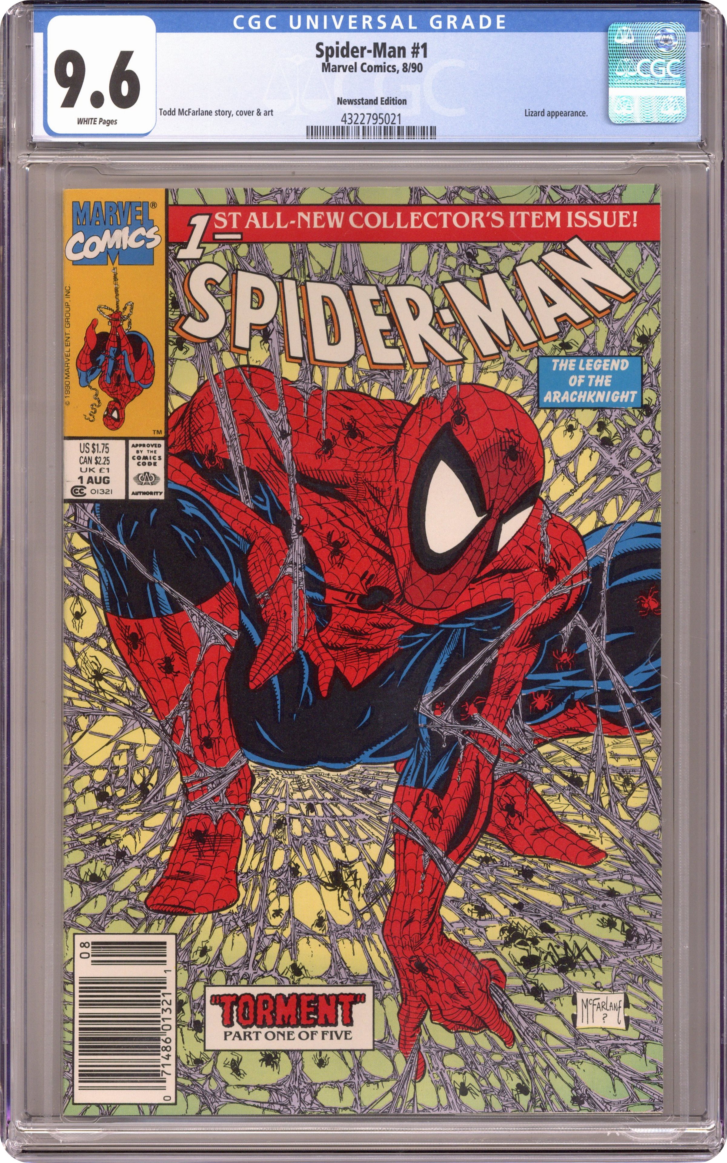 Unbagged Newsstand Edition. Torment: Part 1 of 5. Story, art and cover by Todd McFarlane. Fresh off his legendary run on Amazing Spider-Man, super-star artist Todd McFarlane is given the reigns to his very own Spidey title. Right out of the gate the wall-crawler will be challenged like never before as mysterious and ominous drums in the distance are driving the savage Lizard to cut a swath of death and destruction through the streets of New York City. Can Spider-Man discover the one responsible for this madness before his arch foe causes more damage? NOTE: Webbing on cover may be grey or purple. Cover price $1.75. Grade: CGC 9.6 explanation of grade Condition: Used (collectible)