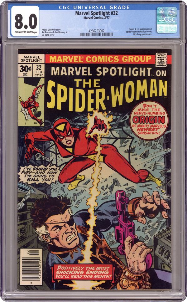 Ended Dec 21 2023 Winning Bid $140 Origin and 1st appearance of Spider-Woman. Cover pencils by Gil Kane and John Romita (alterations), inks by Dick Giordano (?) and John Romita (alterations). Dark Destiny!, script by Archie Goodwin, pencils by Sal Buscema (breakdowns) and Jim Mooney (finished art), inks by Jim Mooney; the mysterious Spider-Woman is tricked by Hydra into trying to kill Nick Fury. Continued in Spider-Woman #1. 36 pages, full color. Cover price $0.30. Grade: CGC 8.0 explanation of grade Condition: Used (collectible)