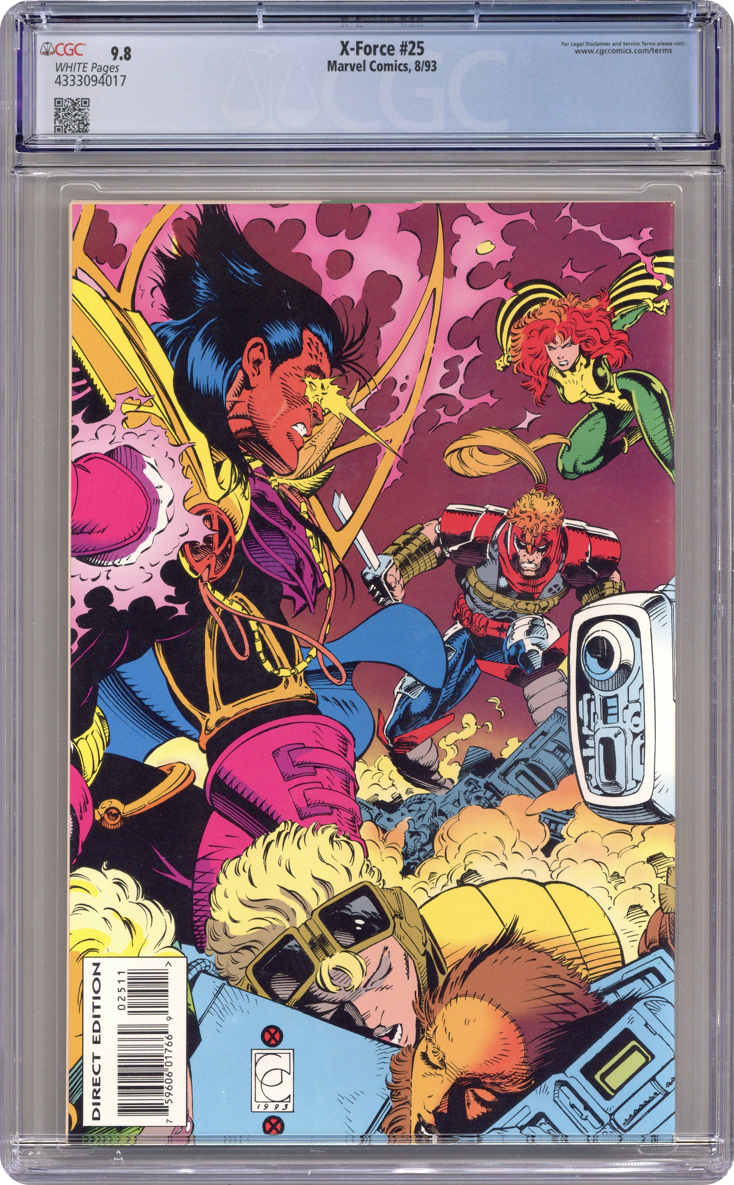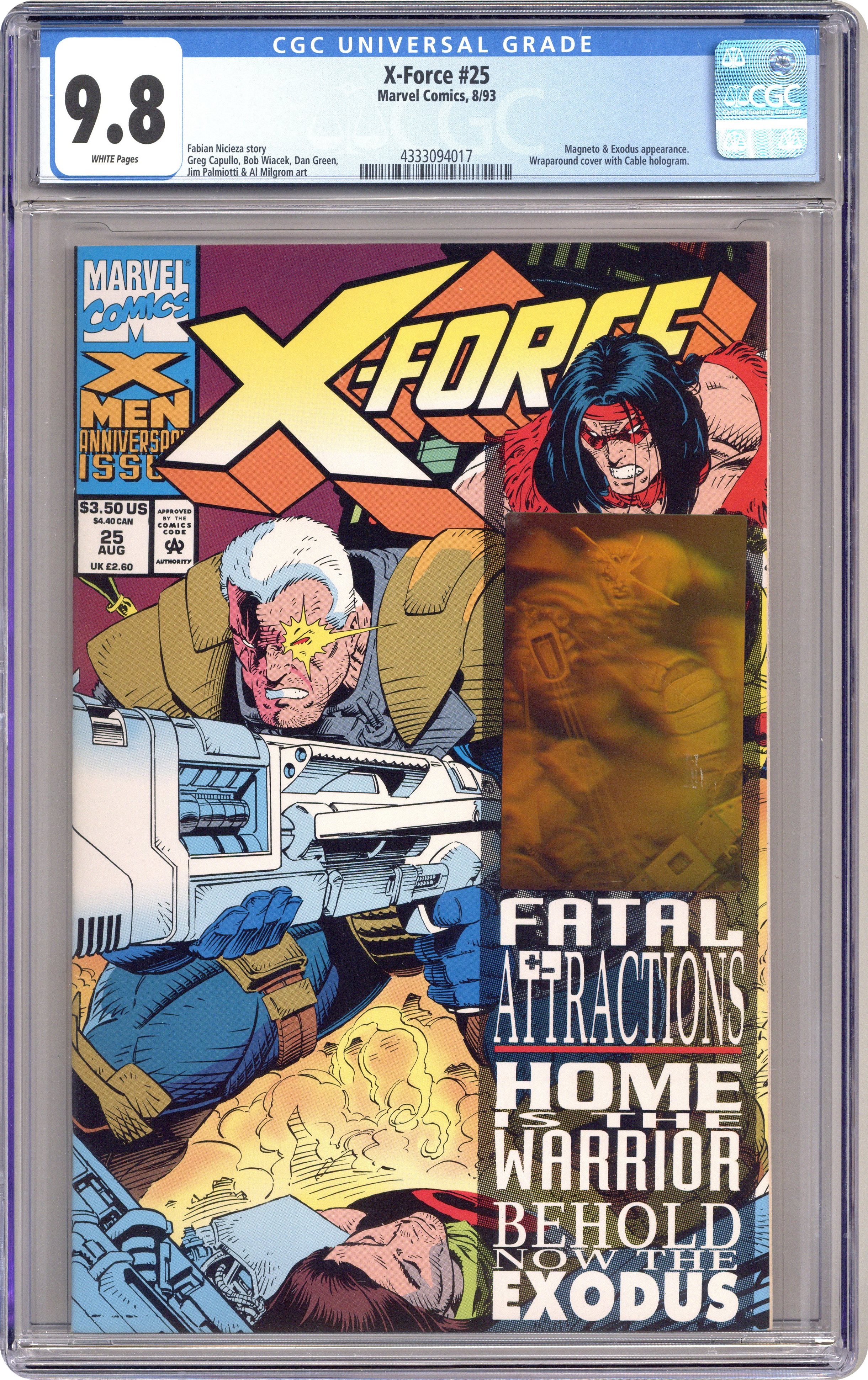 Cardstock wraparound cover. Cover art by Greg Capullo. Fatal Attractions: Back to Front, script by Fabian Nicieza, pencils by Greg Capullo, inks by Bob Wiacek, Dan Green, Matt Ryan, Jimmy Palmiotti, Scott Hanna, Kevin Conrad, and Al Milgrom; Cable returns to the Team; Magneto brings X-Force to the newly reformed Graymalkin; Maggie tears Cable up. Fatal Attractions Cross-Over; Cont. in Uncanny X-Men #304. 52 pgs. $3.50. Cover price $3.50. Grade: CGC 9.8 explanation of grade Condition: Used (collectible)