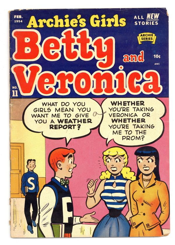 Cover pencils by Bill Vigoda, inks by Joe Edwards. "Missed Bliss"; After putting a piece of wedding cake under her pillow Betty has a dream about getting married to Archie. Shelby Cycle Co. ad with Yogi Berra. "The Key Ring," pencils by George Frese; After losing a key that opens a locket Veronica offers a kiss as a reward to anyone who can find it for her. Untitled Katy Keene story, script by Bill Woggon, pencils by Hazel Marten (as Bill Woggon), inks by Hazel Marten (as Bill Woggon) and Bill Woggon (faces); Chubby offers to drive the girls to the malt shop, but Katy refuses to be seen in his hot rod. "A Grim Fairy Tale" one-page story, script and art by Joe Edwards; Veronica wants Archie to keep them past his curfew. "Social Climbers"; Betty and Veronica try to keep Archie and Reggie away from Veronica's attractive cousin. "The Last Word," art by Samm Schwartz; Suzie only agrees to go out with Ferdie when she finds out he's taking her to a high society club. "Stuff about Stars" article; News on movie stars and the latest films. "Meat the Host" one-page story, pencils by George Frese; What to serve the birthday boy when he's not allowed to eat sweets? "Late for School," pencils by Tom Moore, inks by Joe Edwards; Archie breaks a date with Betty to be at school--on a Saturday. "Trust Buster!" one-page story, pencils by Dan DeCarlo and Joe Edwards, inks by Joe Edwards; Veronica overhears what she thinks is Archie talking about another woman. Archie Fun Page. Archie ad. "Fashion Passion!", script by Sy Reit, art by Harry Lucey; Betty tries to make a replica of an expensive, fashionable hat to impress Archie. "The Ringer" one-page story, script by Frank Doyle, art by Harry Lucey; The girls show off the latest fashion fad and naturally the boys must make light of it. Archie Fun Page. "It's Nice to Have a Man Around the Mouse," script by Sy Reit, art by Bill Vigoda; Betty pretends she's a defenseless female to get Archie to save her from a mouse. 36 pgs., full color. Cover price $0.10. Grade: GD 2.0 explanation of grade Condition: Used (collectible)