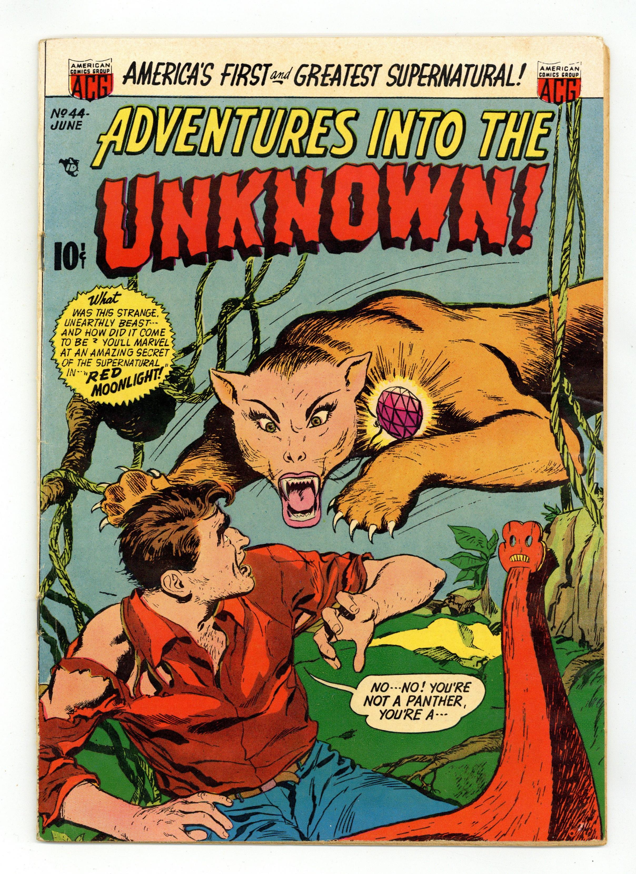 Ended Dec 19 2023 Winning Bid $46 "Red Moonlight," "The Creeper," "The Phantom Fiend," and "The Devil and the War Bride." Edited by Richard E. Hughes. Cover by Ken Bald. Stories by Jon Blummer, Ken Bald, Paul Gattuso, and Pete Riss. Spine-chilling tales of suspense, horror, and the supernatural—prepare yourself for Adventures into the Unknown! 36 pages, full color. $0.10. Cover price $0.10. Grade: VG 4.0 explanation of grade Condition: Used (collectible)