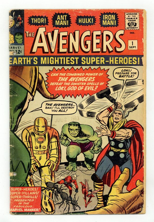 Ended Jan 31 2024 Winning Bid $1,725 Cover pencils by Jack Kirby, inks by Dick Ayers. In this first landmark issue, Thor, Hulk, Iron Man, and Ant Man form the Avengers in "The Coming of the Avengers!", script by Stan Lee, pencils by Jack Kirby, inks by Dick Ayers; Loki, having been previously captured by Thor, is being held prisoner at the Isle of Silence in Asgard; His physical form may be confined there, but by means of thought projection his disembodied self travels to Earth in search of revenge; He spots Thor in his human identity of Dr. Don Blake, but resists defeating him as it would be a hollow victory compared to defeating him as Thor; After hours of searching, Loki happens across the Hulk and devises a wicked plan to entice Blake to transform into Thor; Hours later, newspapers print articles about the Hulk being on the rampage again and a manhunt begins; The Hulk's friend, Rick Jones, reads the article with disbelief and meets with members of the Teen Brigade in order to find help to track Hulk down to find the truth; They attempt to contact the Fantastic Four but Loki interferes with the radio signal, diverting it to Don Blake; He decides to transform into Thor to help the Teen Brigade; Unknown to Loki, the radio signal is also picked up by Ant-Man, the Wasp, and Iron Man, who also travel to assist; Iron Man, Ant-Man and the Wasp pursue the Hulk to an auto factory in Detroit; Thor appears with Loki to clear Hulk's name; Suddenly Loki makes himself radioactive forcing the heroes to retreat; Luckily, Loki stands over a trapdoor and Ant-Man's ants trigger a switch, dropping him into a lead-lined tank; Upon celebrating their victory, Ant-Man and the Wasp point out how well they could work as a team, and that they should work together in future; The Wasp decides they should call themselves the Avengers, and everybody agrees. 36 pgs., full color. $0.12. Cover price $0.12. Grade: GD- 1.8 explanation of grade Condition: Used (collectible)