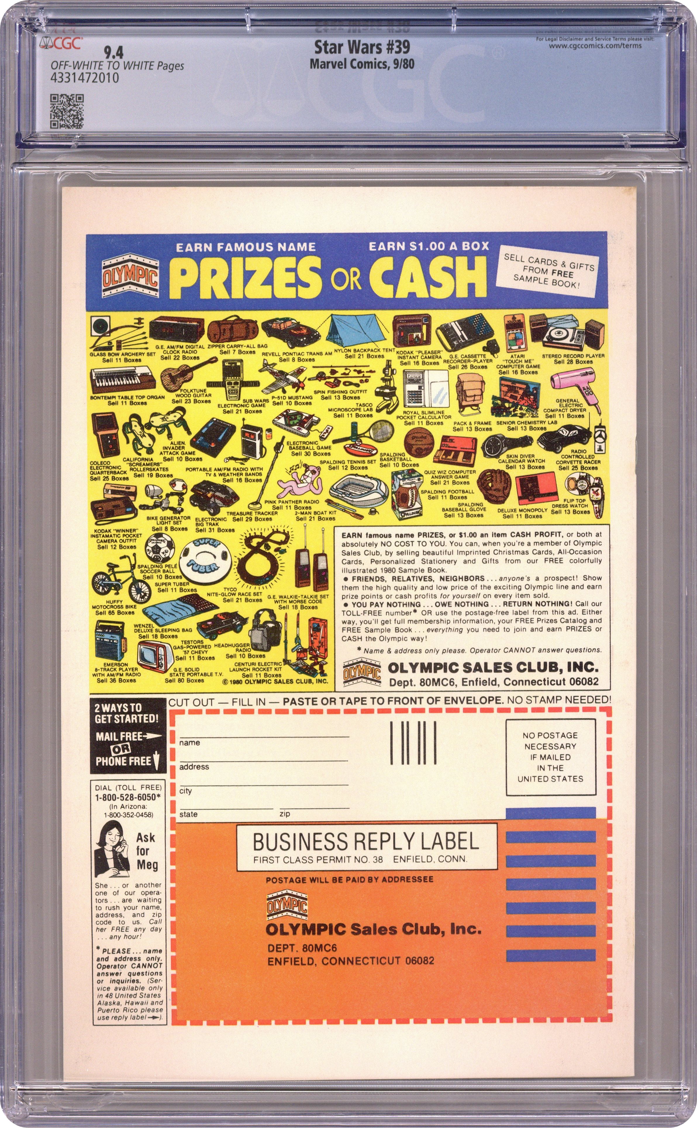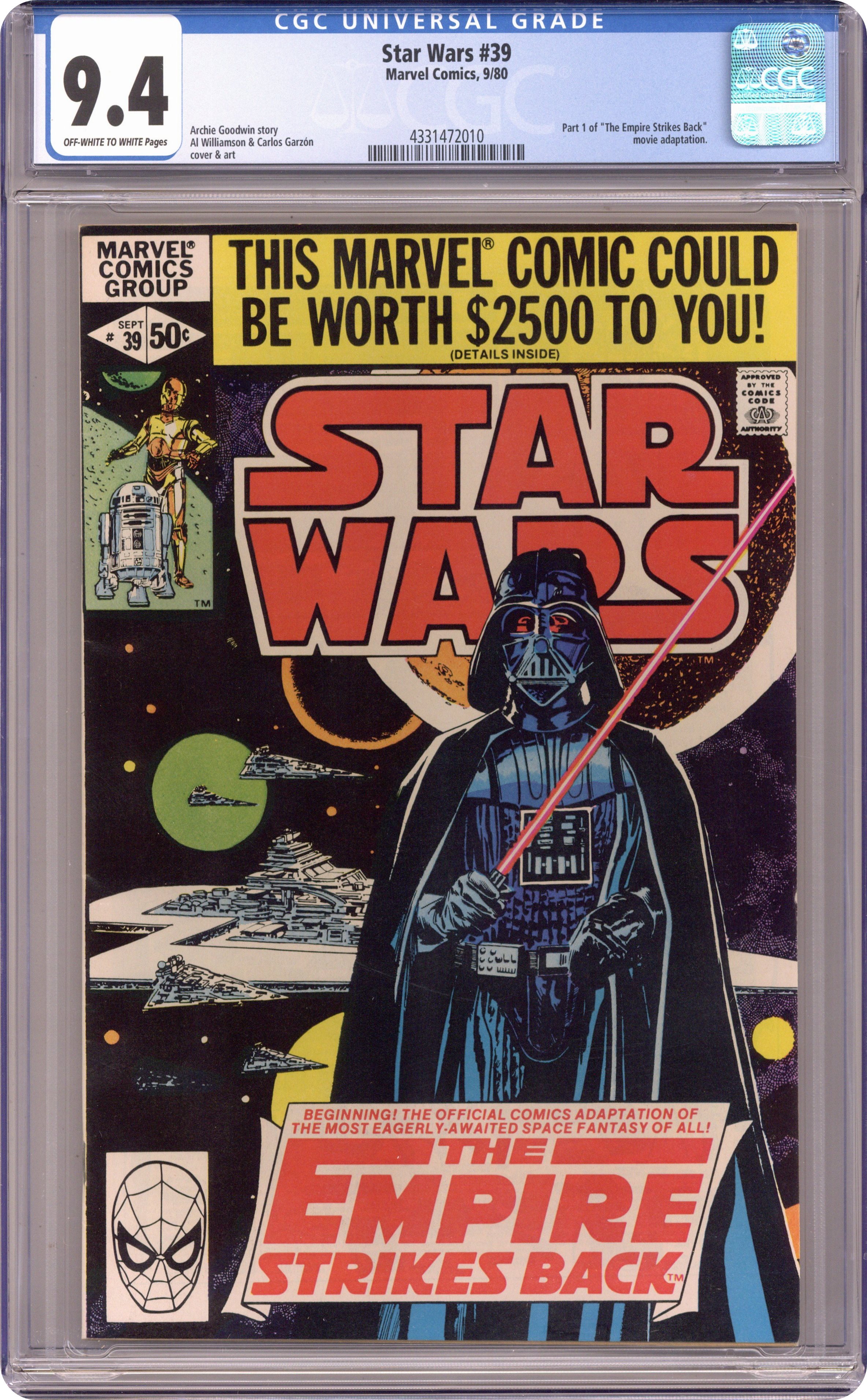 Direct Edition. The Empire Strikes Back: Part 1 of 6. "The Empire Strikes Back." Script by Archie Goodwin, art by Al Williamson and Carlos Garzon. Note: Part 1 of movie adaptation; based on the movie script; both Williamson and Garzon pencil and ink the art for this series. Cover by Williamson and Garzon. Cover price $0.50. Grade: CGC 9.4 explanation of grade Condition: Used (collectible)