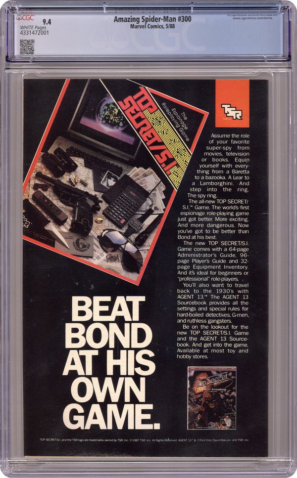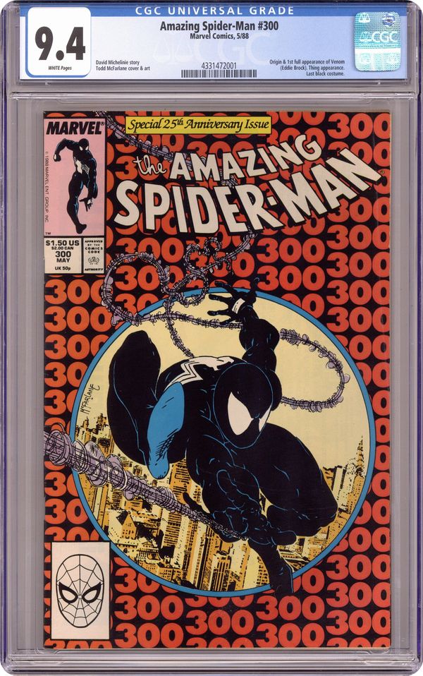 Direct Edition. Giant-sized 25th anniversary issue. First full appearance of Venom in "Venom!", script by David Michelinie, art by Todd McFarlane; Spidey's old alien costume has merged with reporter Eddie Brock who thinks his career was ruined by Spider-Man and the symbiote of the two, Venom, takes on the web slinger; At MJ's request, Spidey returns to the blue and red costume as she now finds his black duds way too creepy; This is the last issue in which Spider-Man appears in his black costume; Thing (of the Fantastic Four) cameo.. Stan's Soapbox Special in place of letters page: Full page editorial by Stan on the occasion of Spider-Man's 300th issue. 52 pgs., full color. Cover price $1.50. Grade: CGC 9.4 explanation of grade Condition: Used (collectible)