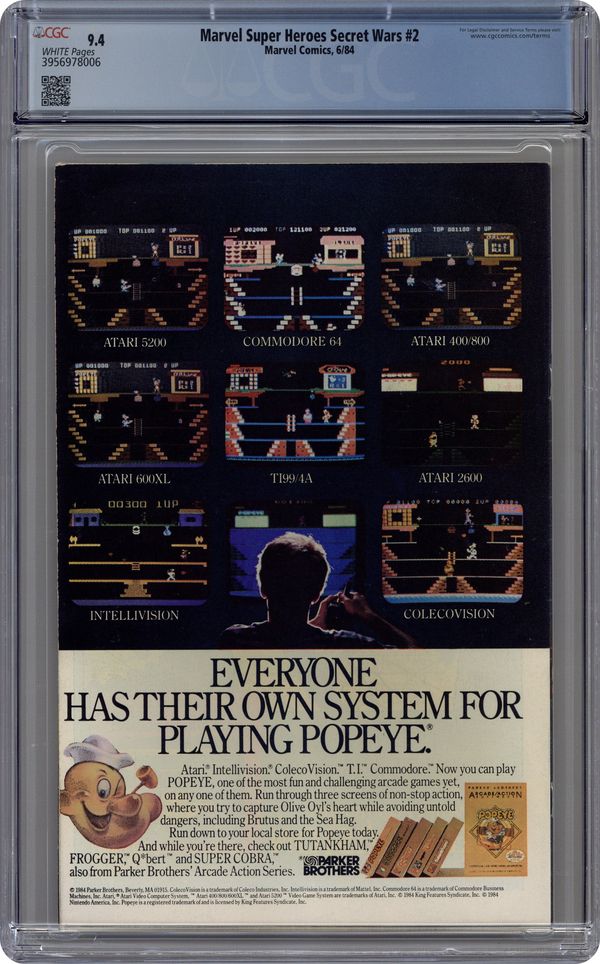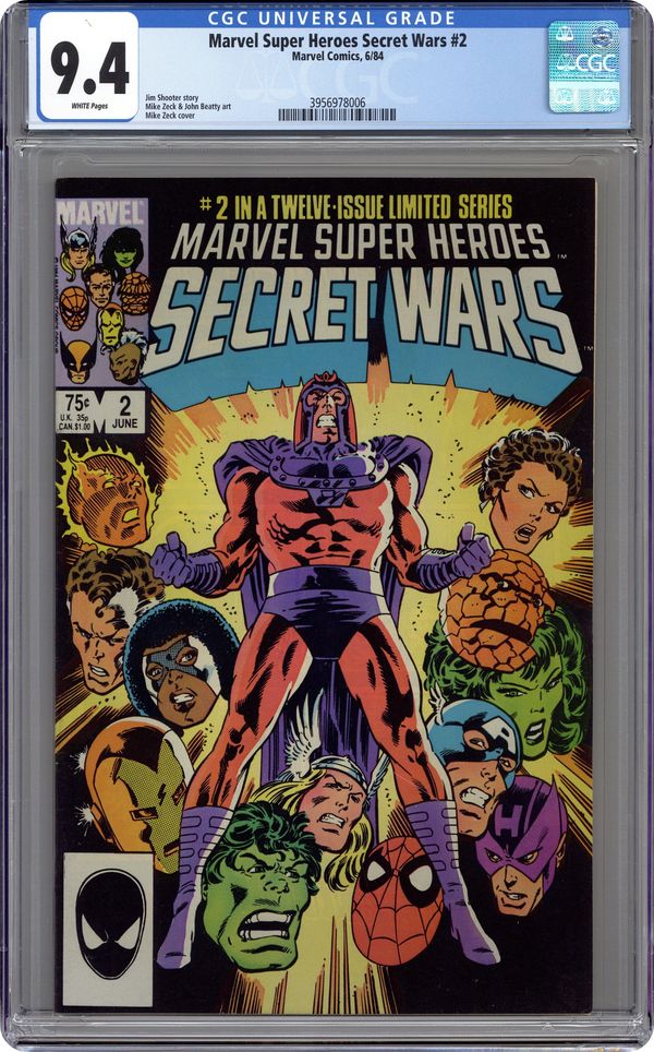 First Printing. Direct Edition. "Prisoners of War!" Part 2 of 12. Story by Jim Shooter. Art by Mike Zeck and John Beatty. On the far side of the universe on a planet simply known as Battleworld, the Avengers (Captain America, Thor, Wasp, Iron Man (James Rhodes), She Hulk, and Captain Marvel), the Fantastic Four (minus the Invisible Woman), X-Men (Professor X, Wolverine, Cyclops, Storm, Nightcrawler, Rogue, and Colossus), Magneto, Spider-Man, and the Incredible Hulk are locked in mortal combat with Doctor Doom, Ultron, Absorbing Man, the Lizard, Molecule Man, Doctor Octopus, Kang the Conqueror, the Wrecking Crew, and the Enchantress. The villains strike first in an unrelenting blitzkrieg. Will the heroes even survive the first titanic battle of this epic struggle? Plus, how do wildcards Magneto and the space god Galactus fit into this game? 36 pages, full color. Cover price $0.75. Grade: CGC 9.4 explanation of grade Condition: Used (collectible)