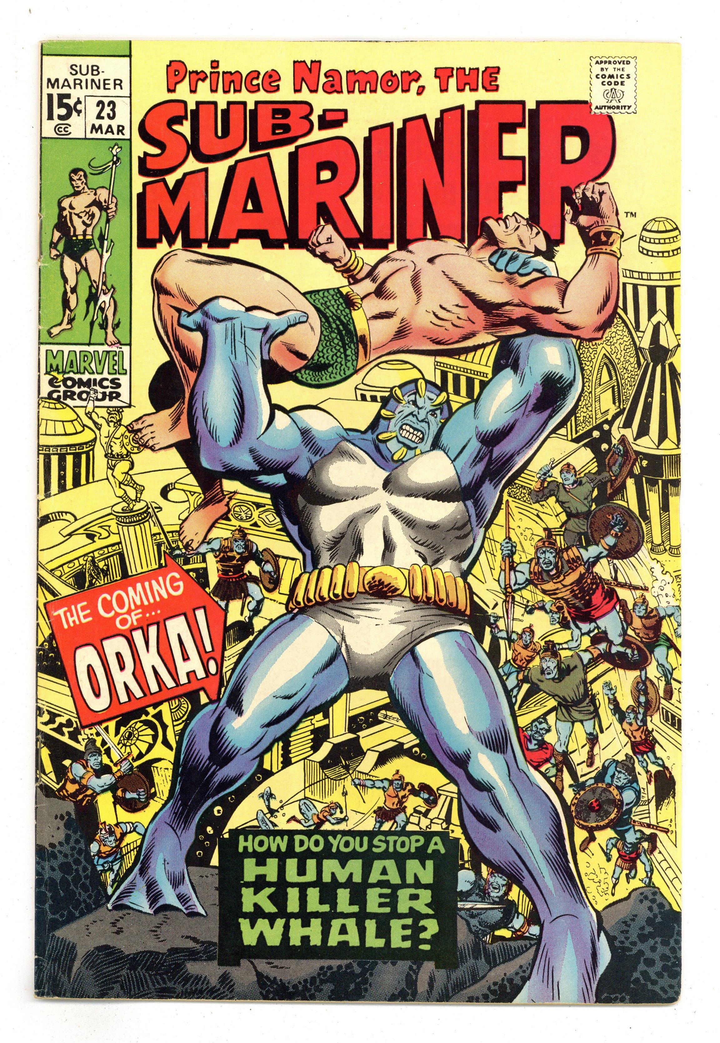 Ended Jan 10 2024 Winning Bid $22 Cover pencils by Marie Severin, inks by Mike Esposito. First appearance of Orka in "The Coming of Orka," script by Roy Thomas, pencils by Marie Severin, inks by Johnny Craig; Returning to his undersea realm, Namor comes across a large herd of killer whales, led by the monstrous Orka, and takes him on; Namor is defeated by Orka, but follows him and discovers that Dr. Dorcas and Krang are actually behind Orka's powers, and are planning an attack on Atlantis; Namor gains the upper hand by threatening Krang's life which prompts Orka to turn against Dorcas; However, Namor's plan comes undone and he's taken down hard by Orka; Following Krang's orders, Orka puts a stun-collar and chains on the Sub-Mariner; Krang then announces an intention of marching into Atlantis with an enslaved Namor. 36 pgs., full color. $0.15. Cover price $0.15. Grade: FN- 5.5 explanation of grade Condition: Used (collectible)