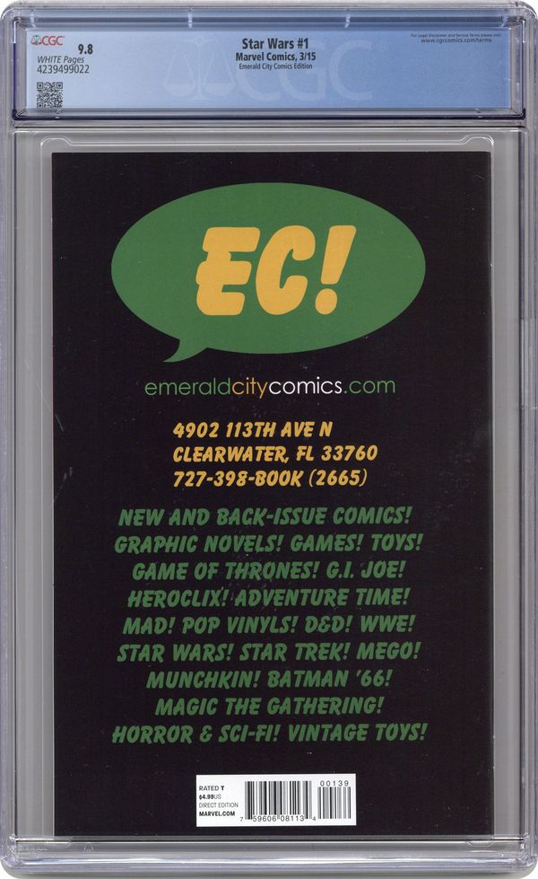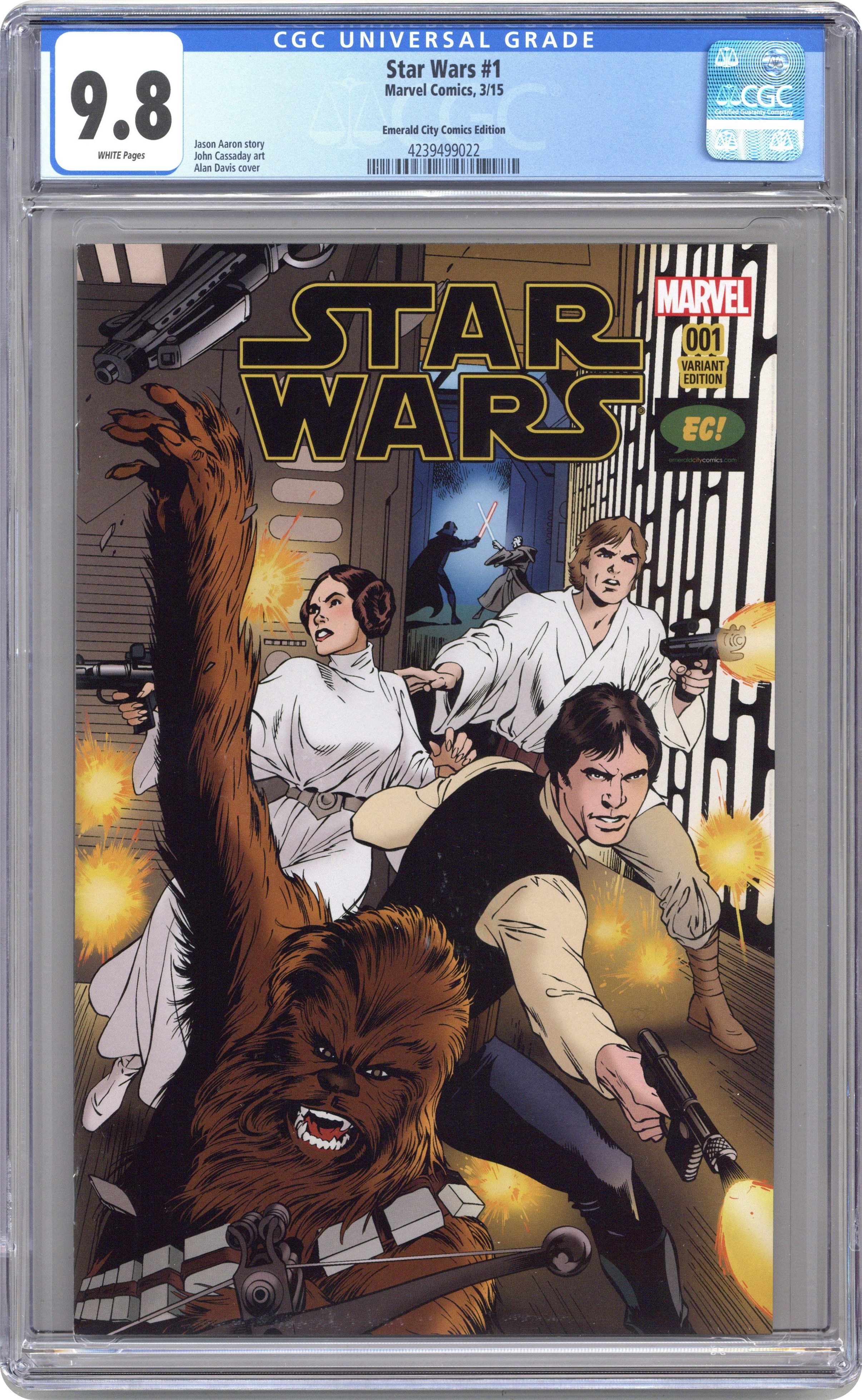 Ended Dec 27 2023 Winning Bid $42 Emerald City Comics Exclusive Variant Cover by Alan Davis. Written by Jason Aaron. Art by John Cassaday. THE GREATEST SPACE ADVENTURE OF ALL TIME RETURNS TO MARVEL! Luke Skywalker and the ragtag band of rebels fighting against the Galactic Empire are fresh off their biggest victory yet-the destruction of the massive battle station known as the Death Star. But the Empire's not toppled yet! Join Luke along with Princess Leia, smugglers Han Solo and Chewbacca, droids C-3PO and R2-D2 and the rest of the Rebel Alliance as they strike out for freedom against the evil forces of Darth Vader and his master, the Emperor. This is the Star Wars saga as only Marvel Comics could make it! 48 pages, full color. Rated T Grade: CGC 9.8 explanation of grade Condition: Used (collectible)