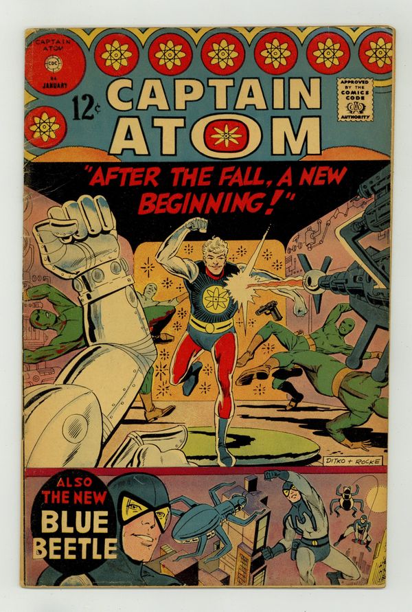 Ended Dec 11 2023 Winning Bid $36 Stories by Steve Ditko, Gary Friedrich and David Kaler. Art by Steve Ditko and Rocco "Rocke" Mastroserio. Cover by Steve Ditko and Rocco "Rocke" Mastroserio. The early adventures of the atomic-powered superhero. Captured and held for ransom, Captain Atom escapes Prof. Koste's gang. Trying to harness his radioactive power, he assumes a new costume and a new look. In the backup story, the new Blue Beetle is wanted for murder. Both stories feature art by Spider-Man co-creator Steve Ditko. After the Fall, A New Beginning; Blue Beetle. 32 pages, Full Color. Cover price $0.12. Grade: VG- 3.5 explanation of grade Condition: Used (collectible)