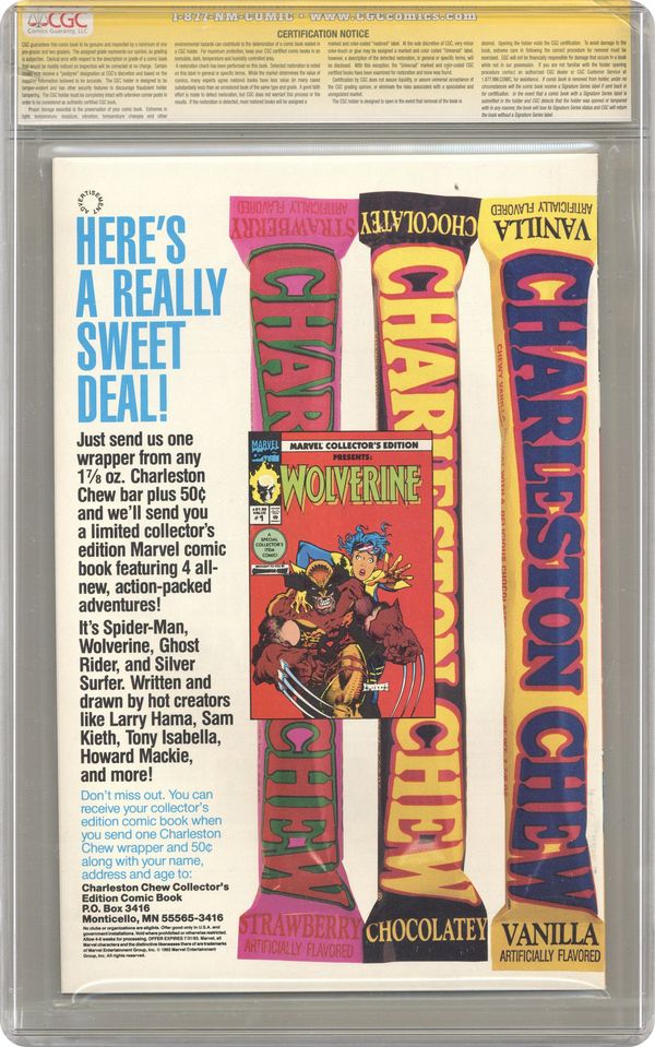 "Biting the Hand that Feeds You!" Guest-starring Wolverine and Beast. Written by Howard Mackie. Art by Andy Kubert and Joe Kubert. A trio of hoodlums attempts to rob Ghost Rider and Johnny Blaze, but is easily subdued. The Beast and Wolverine, the latter following Ghost Rider after noticing his sent was different, give careful chase as Ghost Rider carries the muggers off. Nearby, mercenary Agent-X fails to negotiate a higher profile percentage and level of control with his employer, Frederick Penner. Agent-X returns to his Next Wave cohorts, Snare and Turk, to deliver the news, and the three respond by attacking Penner's mansion headquarters. Ghost Rider drops the muggers off with the police and, as he ponders recent events, Dan Ketch's spirits continues his journey through the void. Ghost Rider spots the mercenaries' attack on the Penner estate and, when Turk kills Penner's neighbor for calling for help, Ghost Rider intervenes, but is ensnared in Snares omnium net. Wolverine and the Beast arrive, free Ghost Rider, and join his battle against the mercenaries. Next Wave initially overwhelm the X-Men and blow Ghost Rider apart, but he regenerates, defeats them, and gives them all the penance stare. Wolverine cautions Ghost Rider that his link to Dan is slipping, and Ghost Rider leaves. Wolverine and the Beast also leave, ignoring Penner's offer of employment. 32 pages, FC. Cover price $1.75. Grade: CGC 9.8 explanation of grade Condition: Used (collectible)