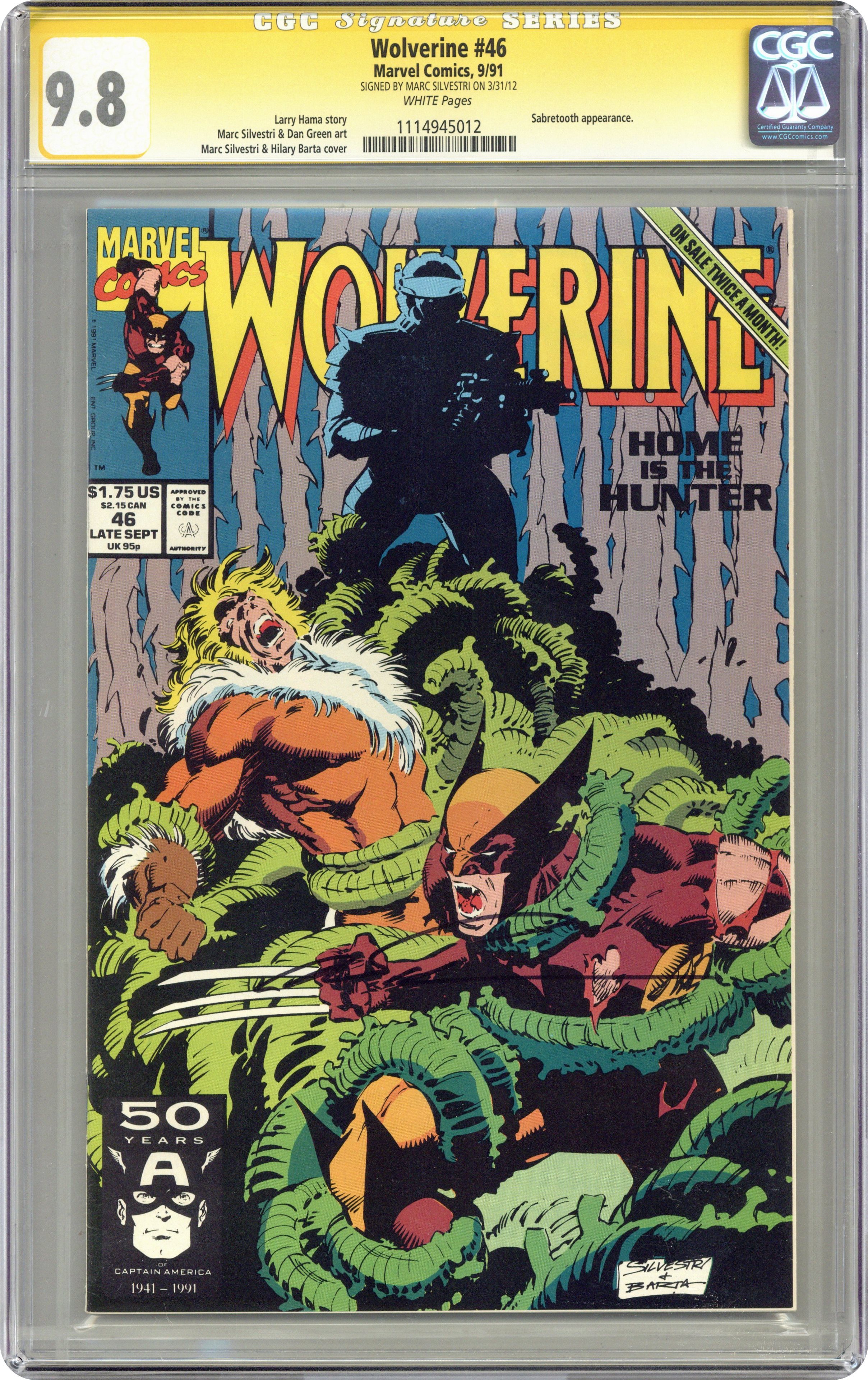 Direct Edition. Part 2 of 2 - "Home is the Hunter...!" Written by Larry Hama. Art by Marc Silvestri and Dan Green. Cover by Marc Silvestri and Hilary Barta. It's a four-way free for all as Wolverine, Sabretooth, Lady Deathstrike, and the Hunter in the Darkness tear into each other through the streets of New York. But who is the mysterious gunman taking potshots at them? 32 pages, FC Cover price $1.75. Grade: CGC 9.8 explanation of grade Condition: Used (collectible)