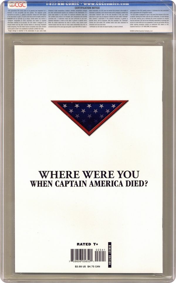 Ended Jun 15 2024 Winning Bid $21 Captain America #25 (2nd Edition; New Cover) The Death of Captain America Act 1: Part 1 of 6 - Steve Epting cover depicting the "Death of Captain America." Pencils and Cover by STEVE EPTING. Captain America #25 (New Print; New Cover) Written by ED BRUBAKER. Cover price $3.99. Grade: CGC 9.8 explanation of grade Condition: Used (collectible)
