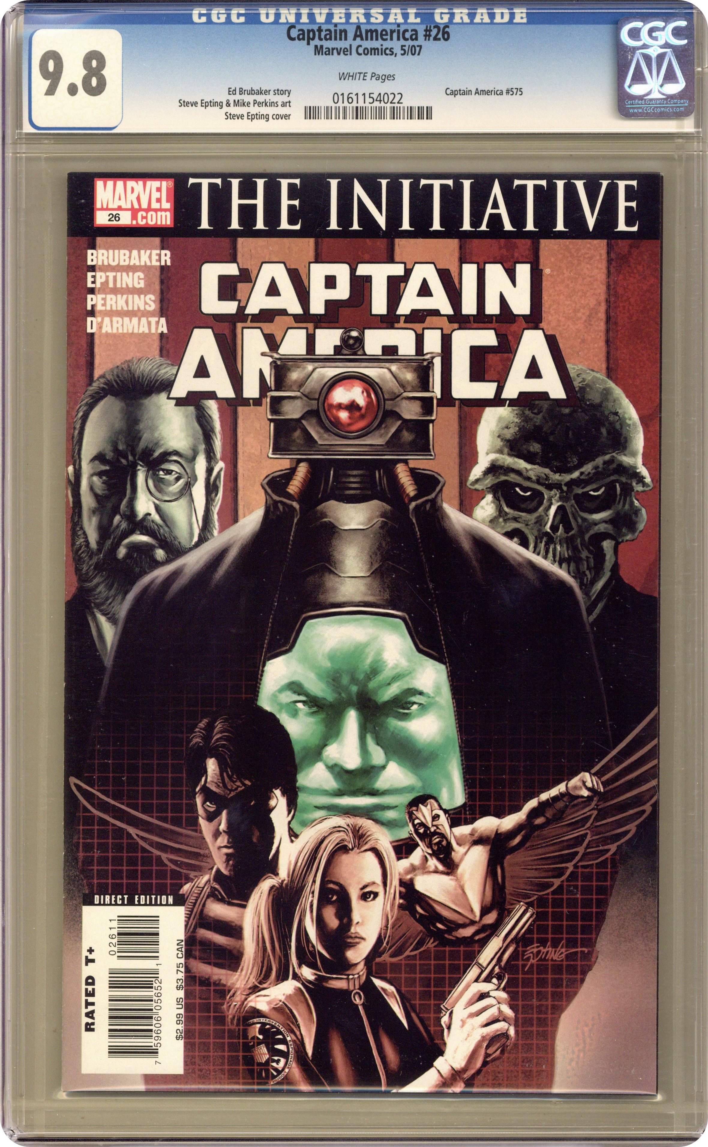 The Death of Captain America Act 1: Part 2 of 6 - Written by ED BRUBAKER Pencils & Cover by STEVE EPTING CLASSIFIED INFORMATION! 32 PGS./Rated T+ Cover price $2.99. Grade: CGC 9.8 explanation of grade Condition: Used (collectible)