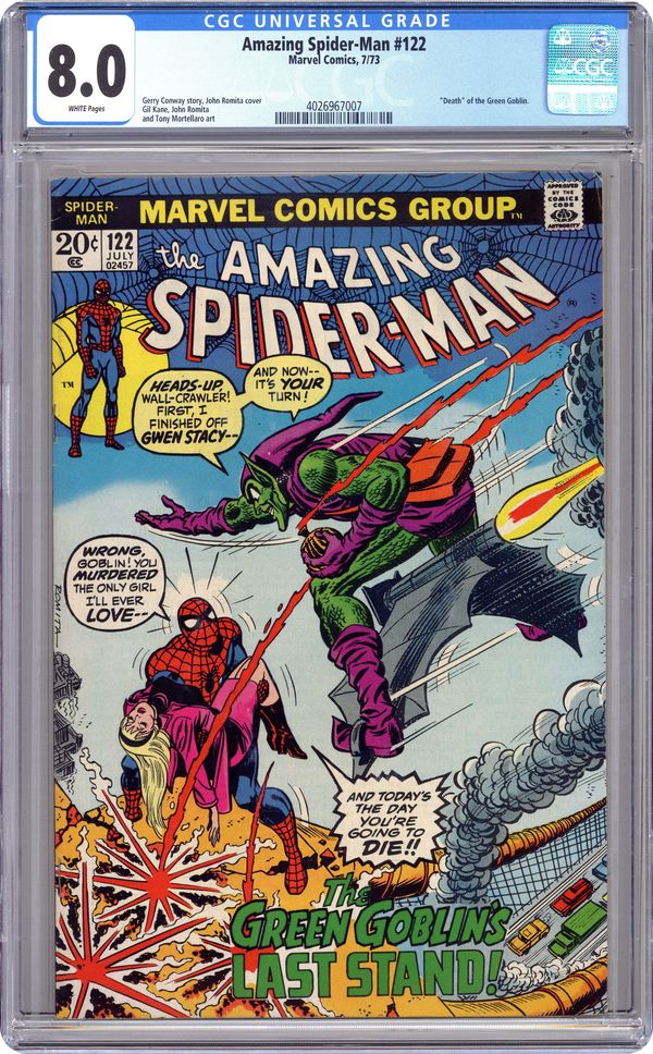 Ended Jan 21 2024 Winning Bid $350 Death of the Green Goblin (aka Norman Osborn) in "The Goblin's Last Stand!" Part 2 of 2. Script by Gerry Conway. Pencils by Gil Kane. Inks by John Romita and Tony Mortellaro (backgrounds). Cover by John Romita. In unfathomable fashion atop the Brooklyn Bridge, Gwen Stacy perished at the hands of the Green Goblin. Spider-Man is devastated. And he furiously lashes out at the goblin, but the purple and green-clad killer gets away! However, a while later, the wall-crawler receives a tip from Joe Robertson about Norman Osborn's whereabouts. And in an abandoned and decrepit warehouse, the Amazing Spider-Man and the Green Goblin fight for the final time! At the end of their epic battle, Peter Parker painfully realizes that revenge is bittersweet. The passing of the goblin won't bring back Gwen. He must find a way to move forward with his life. Perhaps Mary Jane Watson will help. Cameo appearances by Harry Osborn and J. Jonah Jameson. (Notes: The stunning death scene of the Green Goblin inspired a similar moment in the2002 Spider-Man movie. This issue was reprinted in Marvel Tales #99 and again in issue 192.) 36 pages. Cover price $0.20. Grade: CGC 8.0 explanation of grade Condition: Used (collectible)