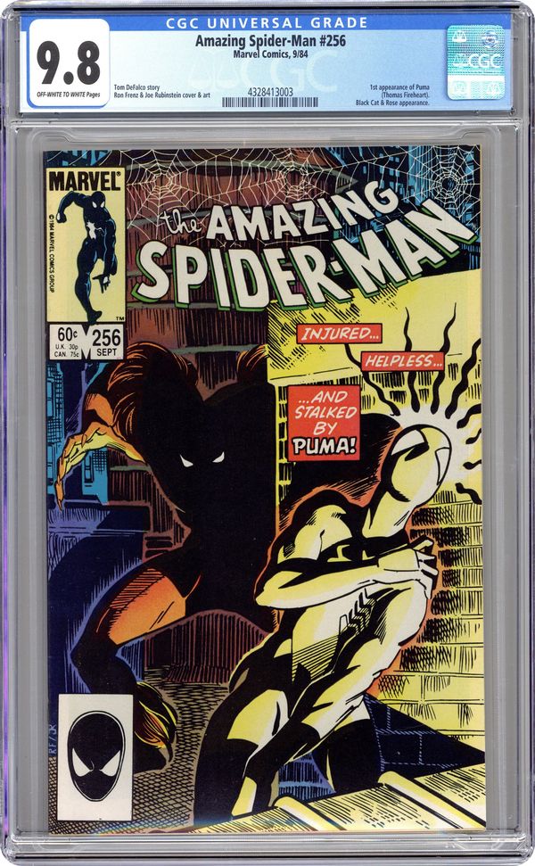 Ended Feb 6 2024 Winning Bid $205 Direct Edition. "Introducing...Puma!" Part 1 of 2. First appearance of Puma. Script by Tom DeFalco. Pencils by Ron Frenz. Inks by Joe Rubinstein. Cover by Ron Frenz and Joe Rubinstein. The Rose is tired of the web-slinger interfering in his criminal activities! So, the underworld boss brings in an assassin from the American Southwest! Puma! Spidey doesn't much about Puma (aka Thomas Fireheart), but he will...very soon! In the meantime, the black symbiote costume keeps Peter Parker up past his bedtime...and then some! Cameo appearances by the Black Cat, Mary Jane Watson, Betty Brant Leeds, and Joe Robertson. (Note: This two-part story was reprinted in Marvel Tales 270 & 271.) 36 pgs. Cover price $0.60. Grade: CGC 9.8 explanation of grade Condition: Used (collectible)