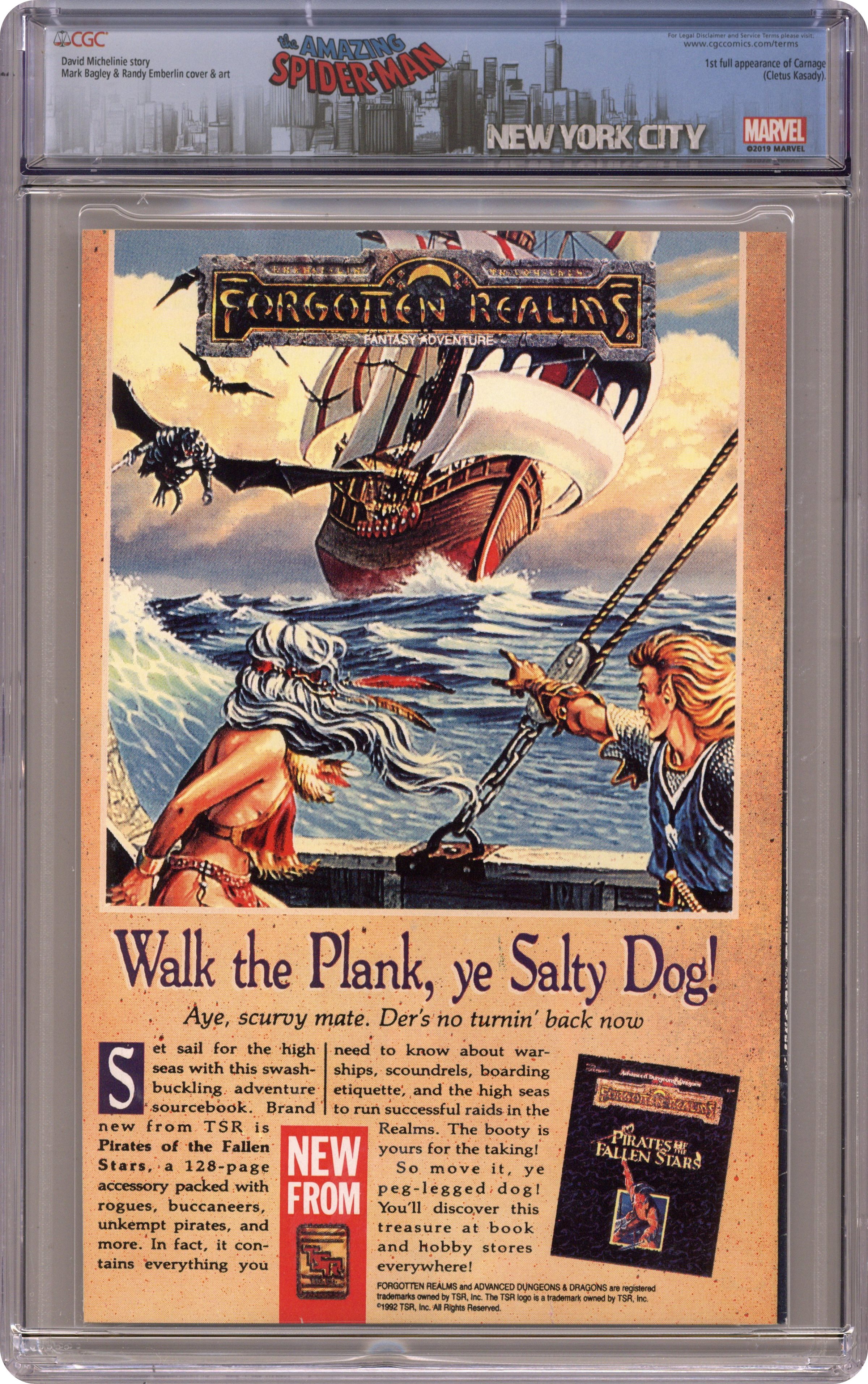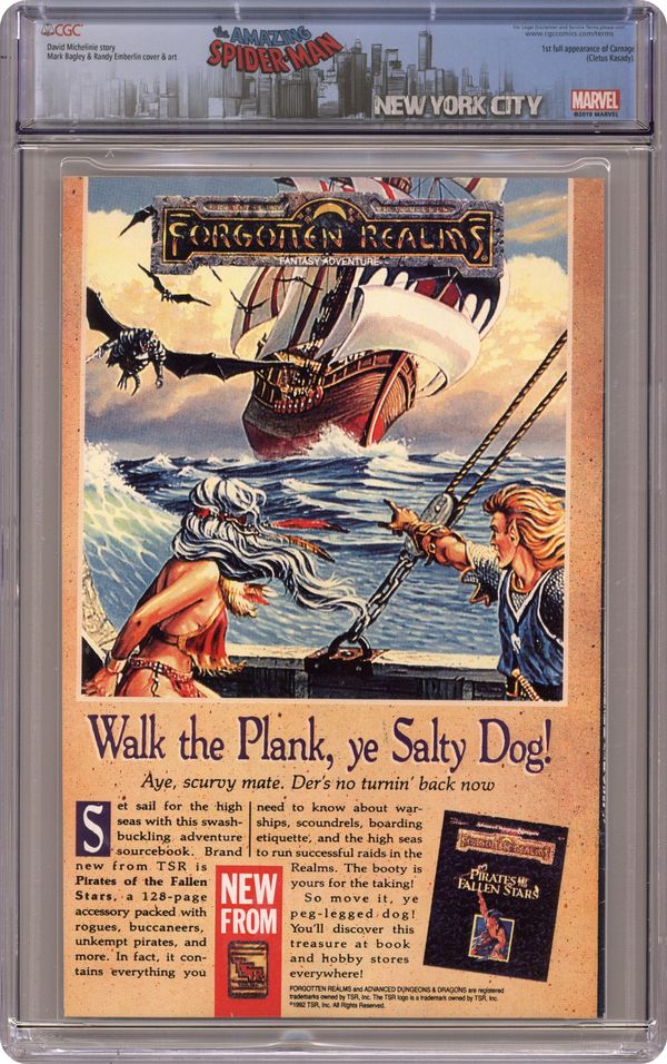 Ended Dec 20 2023 Winning Bid $82 First Printing. Direct Edition. First (full) appearance of Carnage in "Savage Genesis!" Part 1 of 3. Script by David Michelinie. Pencils by Mark Bagley. Inks by Randy Emberlin. Cover by Mark Bagley and Randy Emberlin. Blood runs in the streets as a serial killer roams New York City! And as the web-slinger investigates the murders, he notices a very disturbing similarity to another killer's modus operandi! In a burned-out building in Brooklyn, the spectacular one comes face-to-face with his new homicidal foe...Carnage! Can the wall-crawler end Cletus Kasady's rampage in their very first encounter? Cameo appearances by Aunt May and Mary Jane Watson. Flashback cameo by Venom. (Note: This three-part story was reprinted in 2011 in the trade paperback: Spider-Man -- The Vengeance of Venom.) 36 pages, full color. $1.25 cover price. NOTE: Most of these were distributed with slight printer tears in the bottom edge of the cover. Cover price $1.25. Grade: CGC 9.2 explanation of grade Condition: Used (collectible)