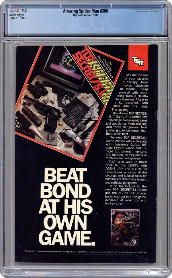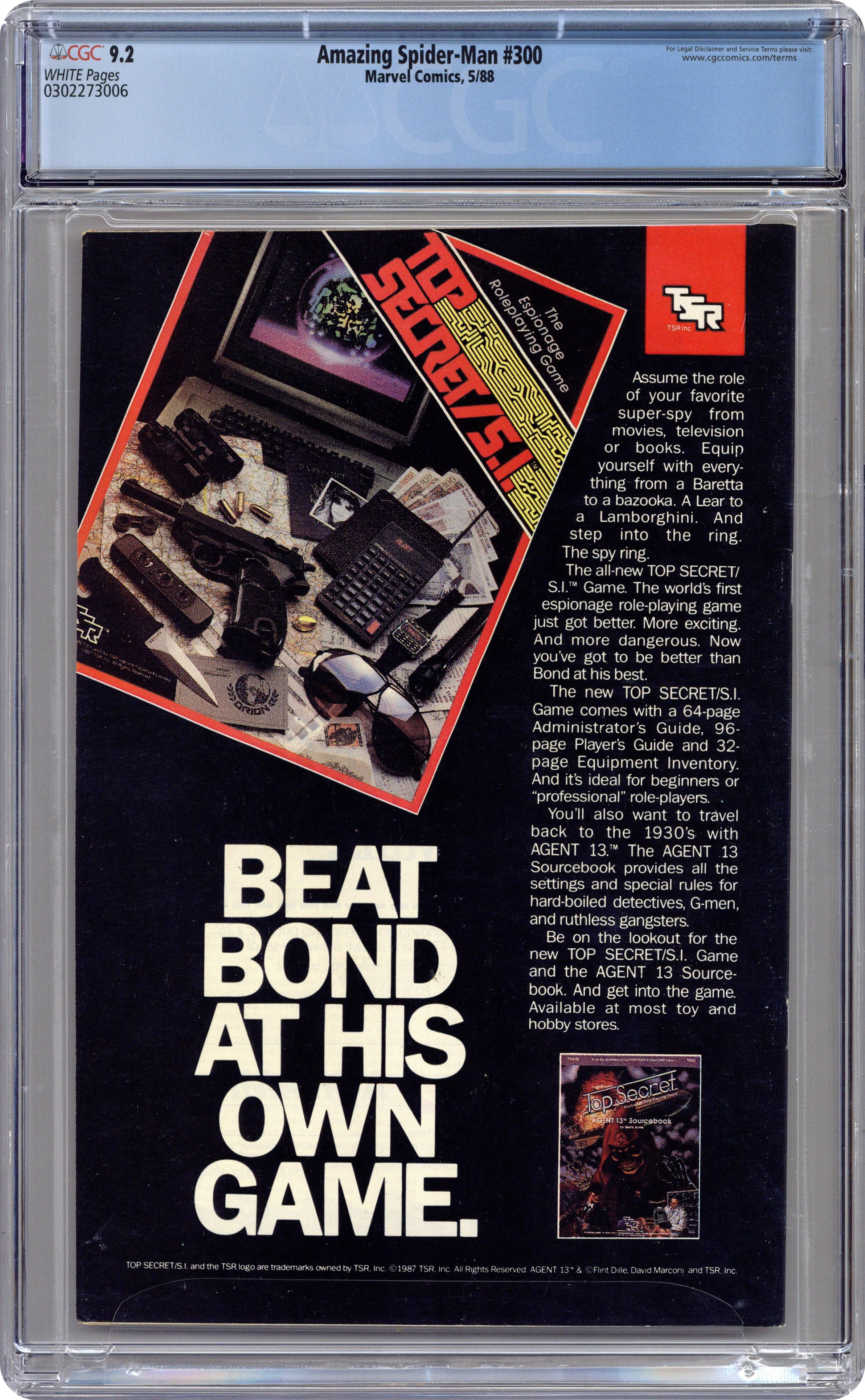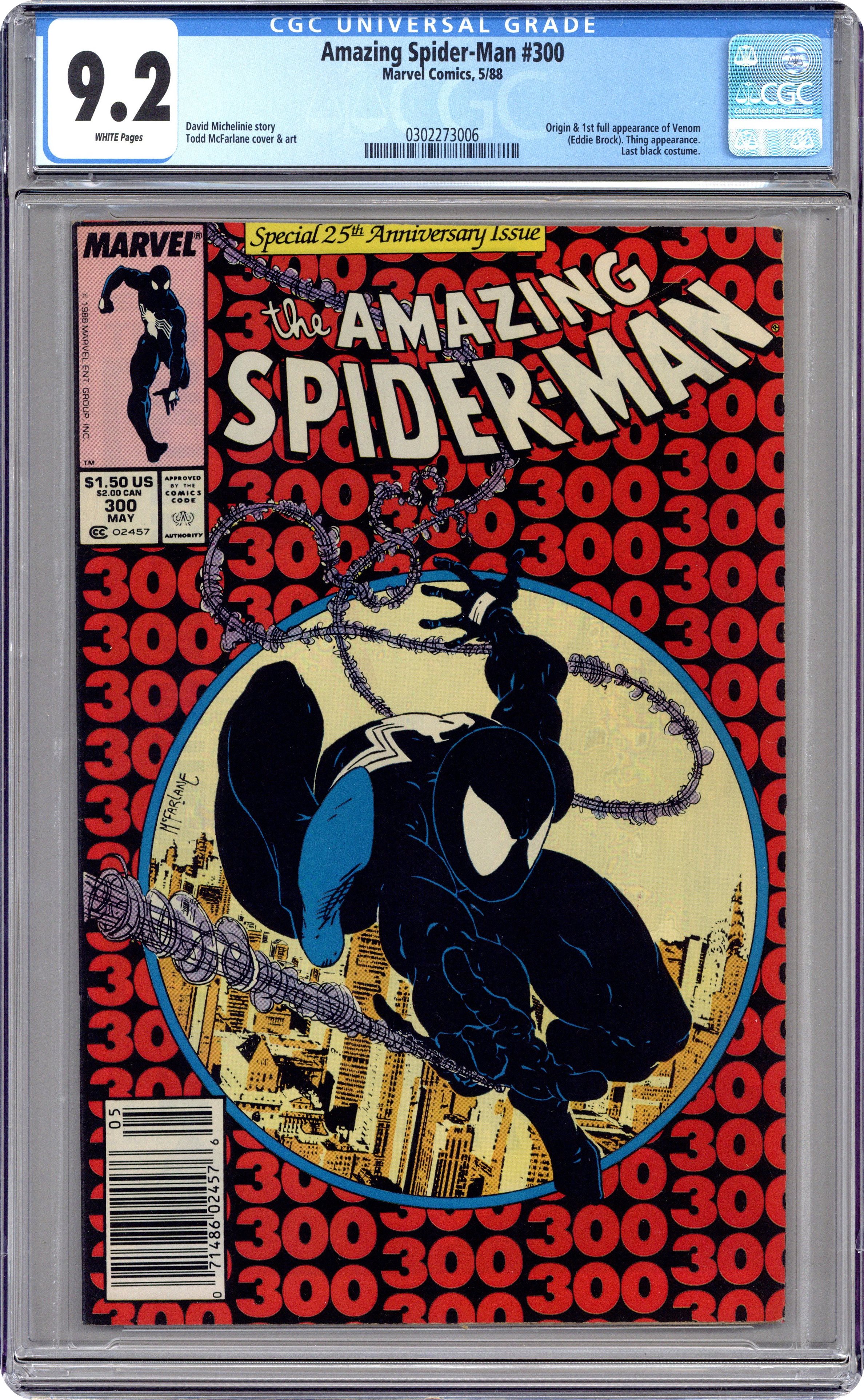 Newsstand Edition. Giant-sized 25th anniversary issue. First full appearance of Venom in "Venom!", script by David Michelinie, art by Todd McFarlane; Spidey's old alien costume has merged with reporter Eddie Brock who thinks his career was ruined by Spider-Man and the symbiote of the two, Venom, takes on the web slinger; At MJ's request, Spidey returns to the blue and red costume as she now finds his black duds way too creepy; This is the last issue in which Spider-Man appears in his black costume; Thing (of the Fantastic Four) cameo.. Stan's Soapbox Special in place of letters page: Full page editorial by Stan on the occasion of Spider-Man's 300th issue. 52 pgs., full color. Cover price $1.50. Grade: CGC 9.2 explanation of grade Condition: Used (collectible)