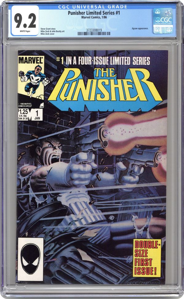 Direct Edition. "Circle of Blood!" Story by Steven Grant. Art by Mike Zeck and John Beatty. Cover by Mike Zeck and Phil Zemelman. After a drug-induced bloody rampage, Frank Castle finds himself behind bars. When he discovers his old enemy Jigsaw, a criminal with a severely scarred face, is responsible, the Punisher sets out to do what he does best. Cover price $1.25. Grade: CGC 9.2 explanation of grade Condition: Used (collectible)