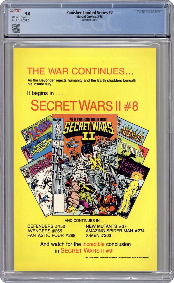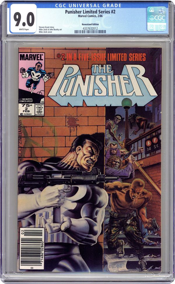 Direct Edition. "Back to War!" Story by Steven Grant. Art by Mike Zeck and John Beatty. Cover by Mike Zeck and Phil Zemelman. NOTE: War Journal Entry: #1053. Out of jail, thanks to The Trust, the Punisher sets out to take out the biggest criminal of them all – the Kingpin. Cover price $0.75. Grade: CGC 9.0 explanation of grade Condition: Used (collectible)