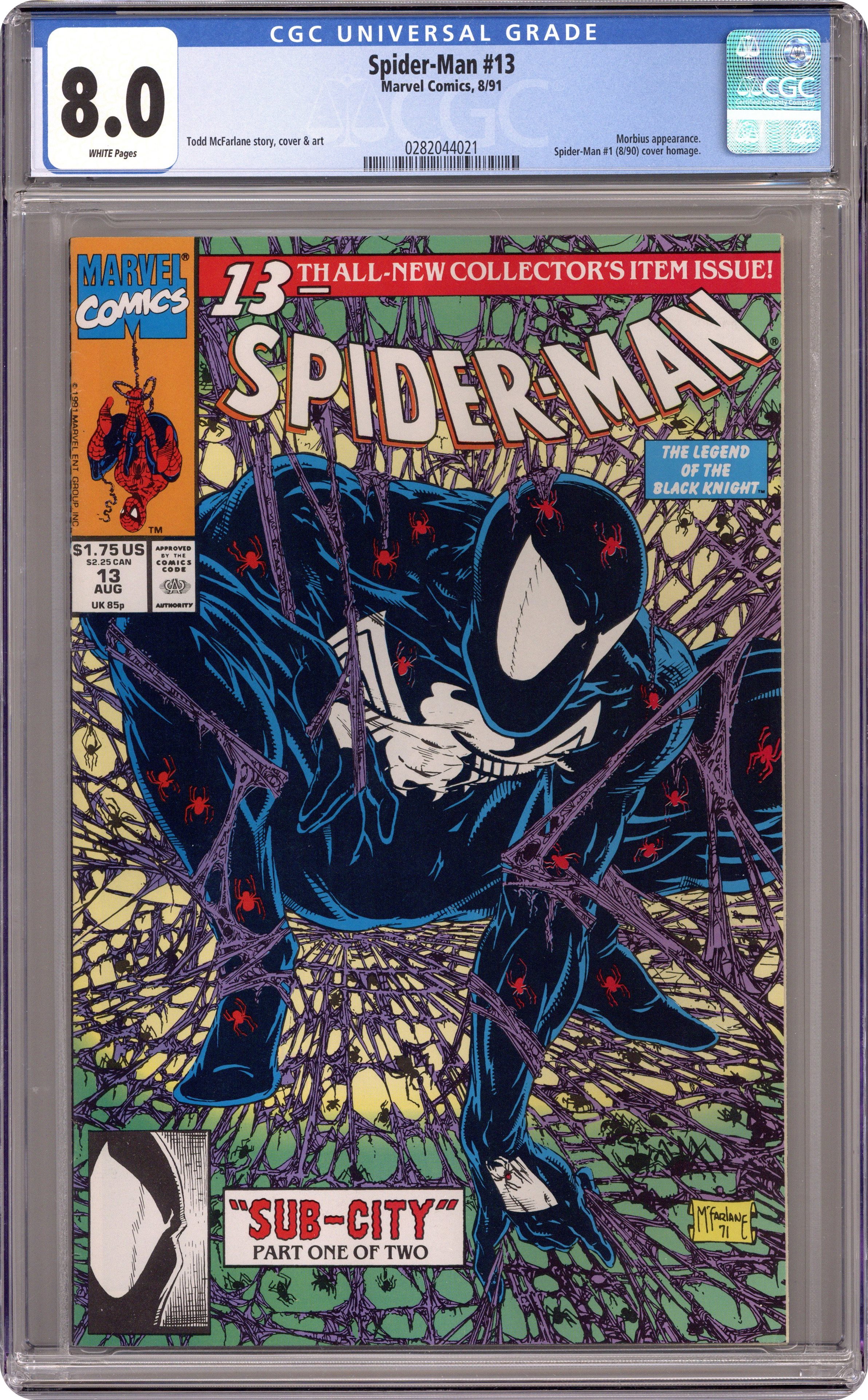 Ended Dec 21 2023 Winning Bid $29 Direct Edition. Sub-City Part 1 of 2. Script and art by Todd McFarlane. Cover by Todd McFarlane. In Midtown Manhattan homeless people are disappearing off the streets. And a Daily Bugle reporter suspects foul play! The wall-crawler decides to stake out the area...and wait for something or someone suspicious to show up. And sure enough...a strange creature does -- right out of the sewer system! Spider-Man wants to follow into the sewers to investigate further, but he needs to wear his old black costume for camouflage. However that's a major nonstarter for Mary Jane...since she hates Spidey's black costume! What is a married web-slinger to do? Cameo appearances by J. Jonah Jameson and Morbius. (Note: The cover is an homage to Spider-Man (1990) issue #1.) 32 pages. Cover price $1.75. Grade: CGC 8.0 explanation of grade Condition: Used (collectible)