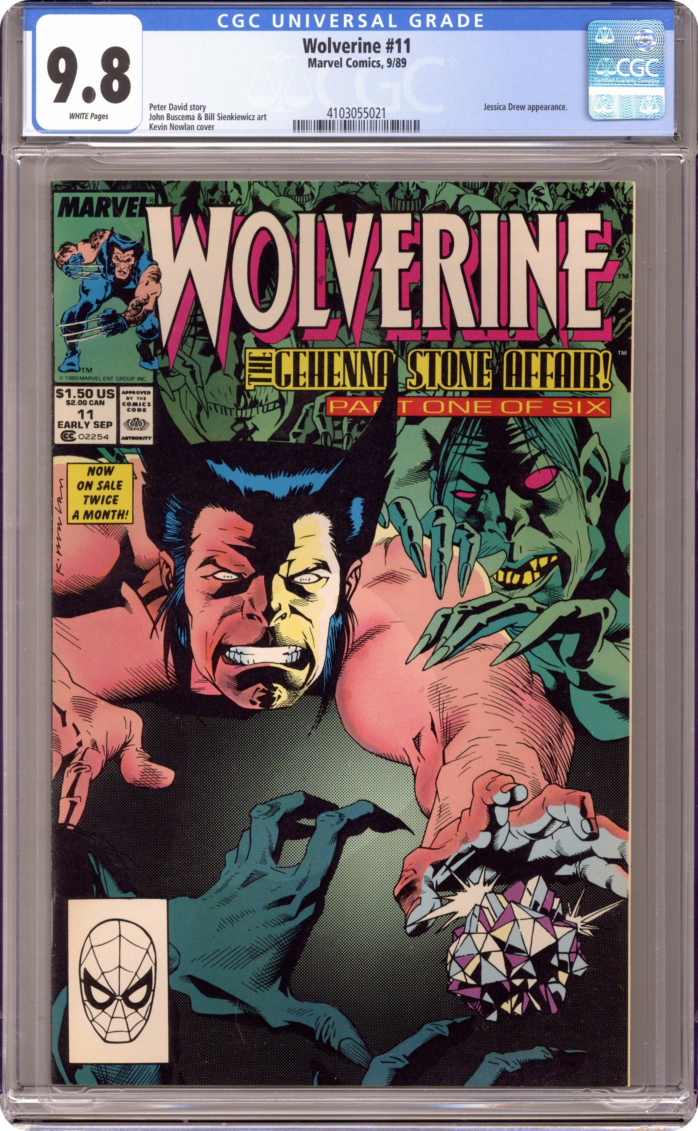 Ended Jan 20 2024 Winning Bid $39 Direct Edition. The Gehenna Stone Affair: Part 1 of 6 - "Brother's Keeper!" Written by Peter David. Art by John Buscema and Bill Sienkiewicz. Cover by Kevin Nowlan. Wolverine travels to San Francisco to help Archie Corrigan with his mentally unstable brother, Burt, who takes on the personalities of his favorite movie superheroes. As if that wasn't crazy enough the feral X-Man crosses claws with a vicious gang of vampires! 32 pages, FC Cover price $1.50. Grade: CGC 9.8 explanation of grade Condition: Used (collectible)