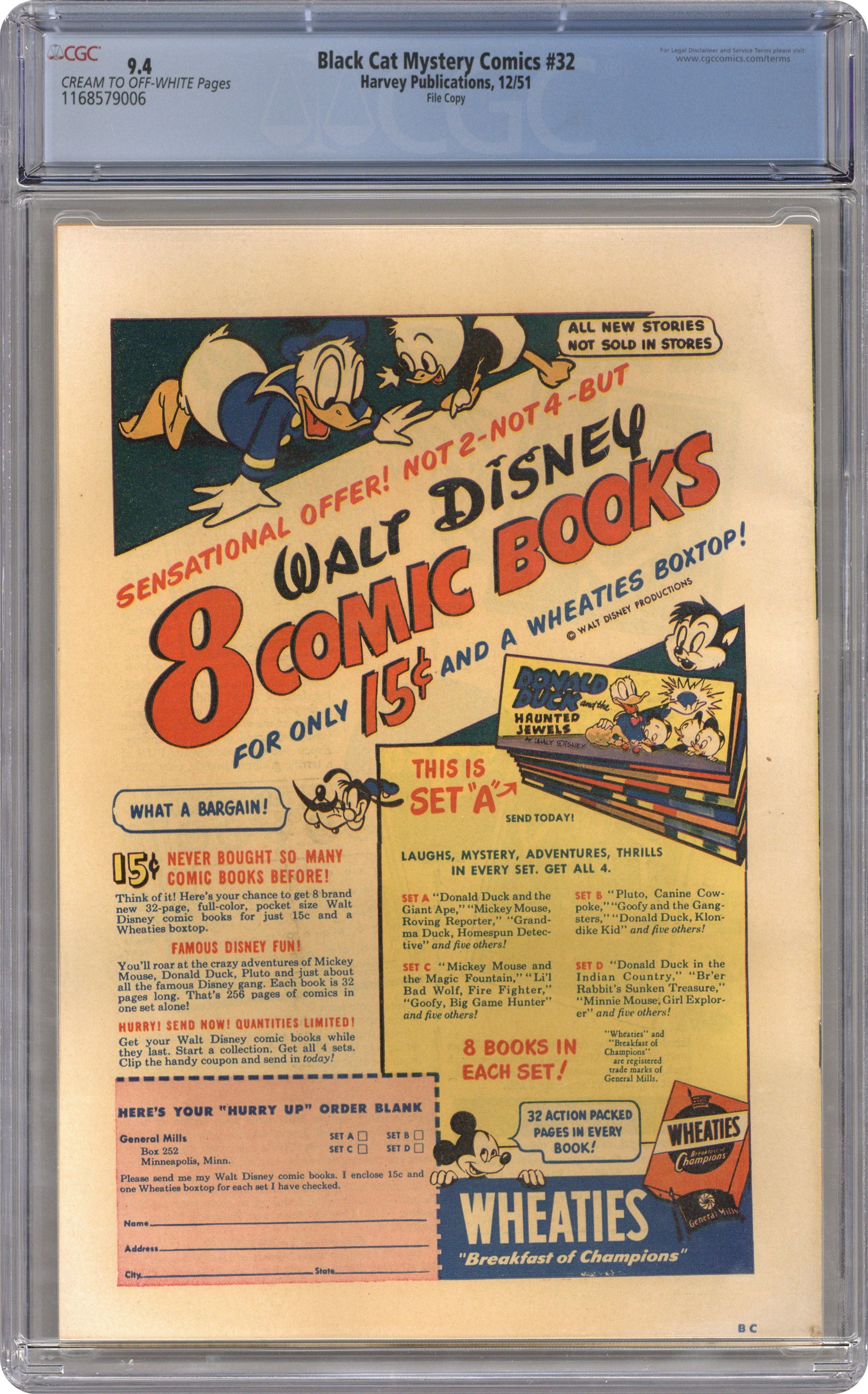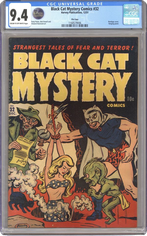 Stories and art by Bob Powell, Howard Nostrand and Rudy Palais. Former superhero comic Black Cat becomes a showcase for Harvey's unique brand of pre-Code horror. A cursed suit causes the fellow who wears it to decompose into a living skeleton. A man who wants to live in a tomb is put on trial by a ghostly jury. In a truly strange story like a 1950s B-movie, a mad scientist creates an octopus-man and sends it on a murderous rampage across the city. Bondage cover by an unknown artist has a little bit of everything. Baron of Death; Satans Suit; Deadly Acres; Arms of Doom. 36 pages, full color. Cover price $0.10. Grade: CGC 9.4 explanation of grade Condition: Used (collectible)