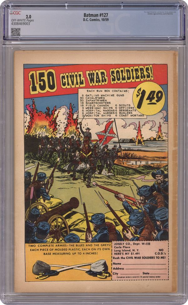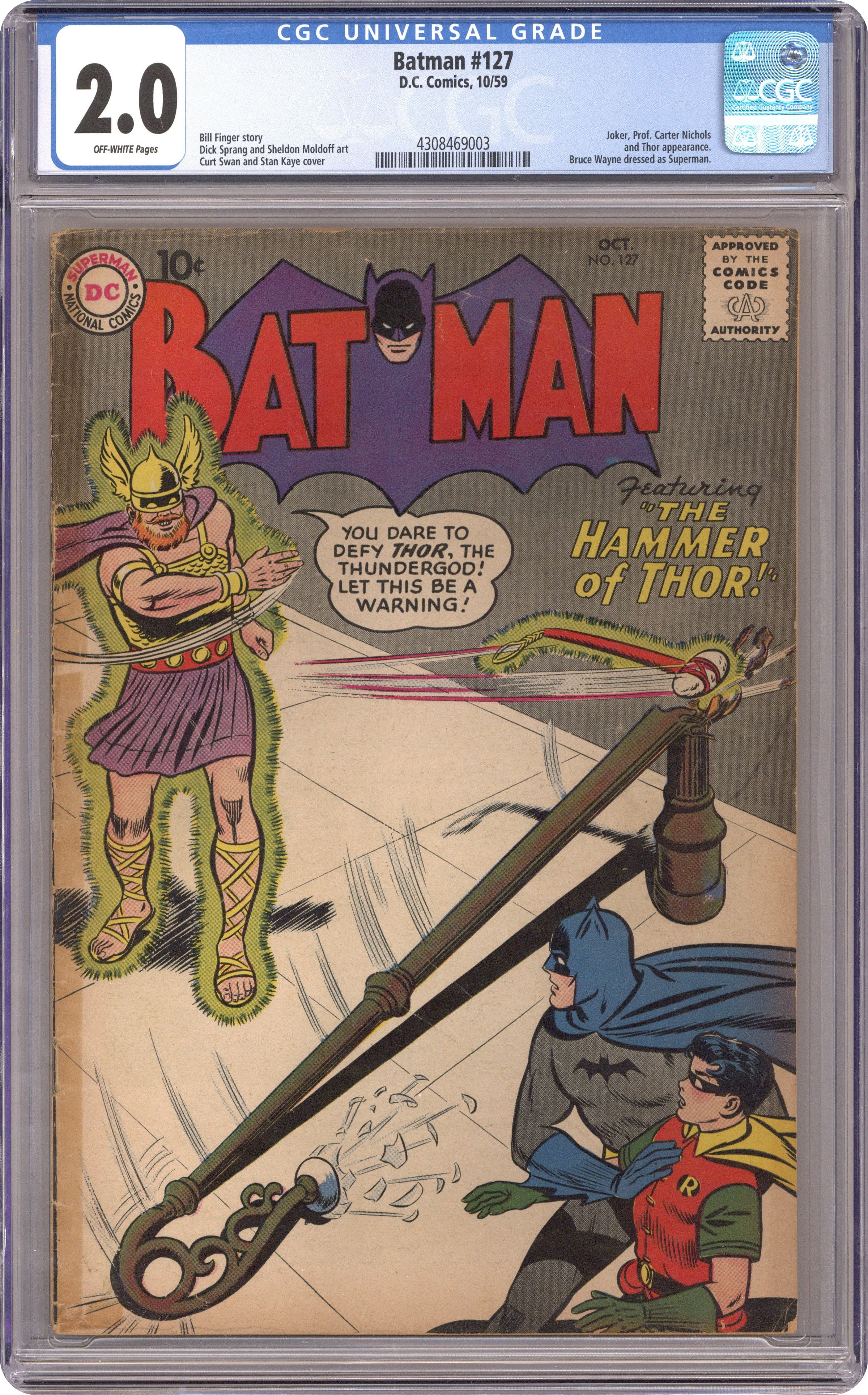 Cover pencils by Curt Swan, inks by Stan Kaye. "Batman's Super-Partner," script by Jerry Coleman, pencils by Dick Sprang, inks by Charles Paris; Accidently gaining super powers from a machine in the Bat-Cave, Alfred wants to use his powers to aid the Dynamic Duo, but he only hinders, not helps, them against the Joker. It's Fun to Learn! public service announcement, script by Jack Schiff, art by Bernard Baily. One-page Jail Jests story by Henry Boltinoff. "The Second Life of Batman," script by Bill Finger, pencils by Dick Sprang, inks by Charles Paris; Professor Nichols has created an alternate history machine and Bruce uses the device to see what would have happened if his parents had not have been killed. One-page Casey the Cop story by Henry Boltinoff. "The Hammer of Thor," script by Bill Finger, art by Sheldon Moldoff; When a hammer in a museum is struck by a meteorite, the charge affects the hammer and its force transforms a museum curator into Thor, God of Thunder, who begins to commit crimes. 36 Pages, Full Color. Cover price $0.10. Grade: CGC 2.0 explanation of grade Condition: Used (collectible)