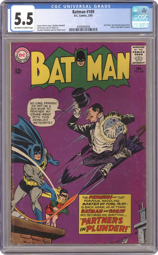 Ended Jan 31 2024 Winning Bid $171 Cover pencils by Carmine Infantino, inks by Joe Giella. Don't Give Fire a Place to Start! public service announcement, script by Jack Schiff, art by Win Mortimer. "Partners in Plunder!", script by France Herron, pencils by Sheldon Moldoff (as Bob Kane), inks by Joe Giella; The Penguin uses an umbrella barrage to trick Batman into planning his next crime for him. "A Bad Day for Batman!", script by France Herron, pencils by Sheldon Moldoff (as Bob Kane), inks by Sid Greene; Batman tells the press about his bad day, in which he returns to the scene of a previous case to retrieve some rope, and spots a jewel thief; He pursues, but a series of bad breaks allows the felon to escape. Fingerprint Facts non-fiction page, script by Julius Schwartz, pencils by Morris Waldinger, inks by Tom Nicolosi. Letter to the editor from comics writer Mike Friedrich. 36 Pages, Full Color. Cover price $0.12. Grade: CGC 5.5 explanation of grade Condition: Used (collectible)