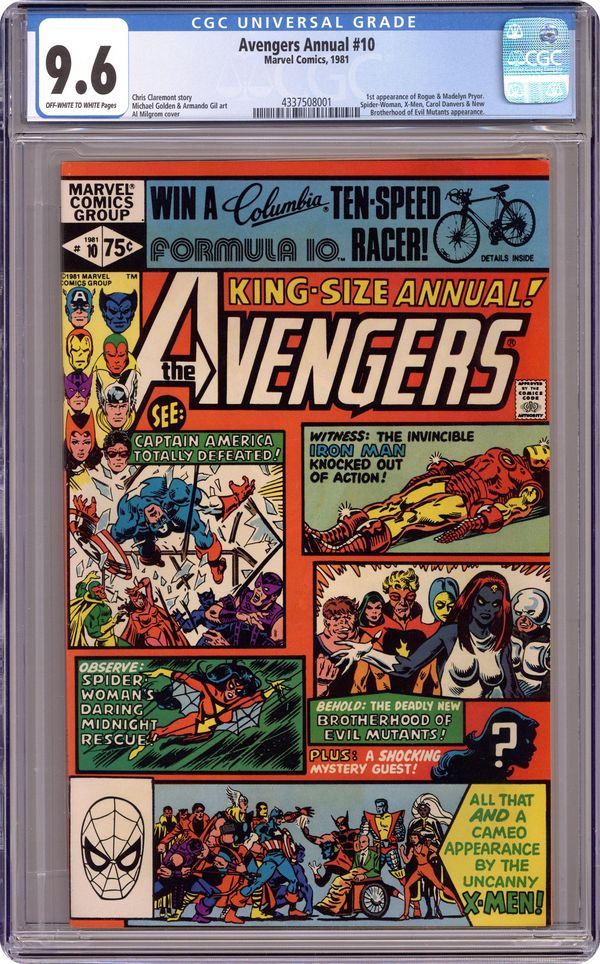 Ended Dec 31 2023 Winning Bid $150 Direct Edition. First appearance of Rogue and Madelyne Pryor in "By My Friends Betrayed!" Spider-Woman, X-Men, Carol Danvers, and New Brotherhood of Mutants guest star. Script by Chris Claremont. Pencils by Michael Golden. Inks by Armando Gil. Cover by Al Milgrom. This action-packed annual has got it all, true believers: the first appearance of Rogue, the spectacular art of Michael Golden, the tragic return of Carol Danvers, and the stupendous struggle between the Brotherhood of Evil Mutants and the mighty Avengers! Following the events of Uncanny X-Men #142, Mystique & her New Brotherhood of Evil Mutants attempt to break four of their members out of Ryker's Island prison! After Rogue and Mystique take down Captain America, Iron Man, and Thor, the rest of the Avengers and Spider-Woman catch up to the villains, and the epic clash erupts! Woven in and around the frantic action at Ryker's Island is the heartbreaking story of Carol Danvers' return to Earth. Her life has fallen apart since leaving for Limbo with Marcus Immortus in Avengers #200, and now, stripped of her powers and memories, Carol begins the long road to recovery. And the first step is an emotional confrontation with her former teammates! Notes: Marvel Super-Heroes #11 (Fall 1992) fills in the details of Carol Danvers' life between Avengers #200 and Avengers Annual #10. The Thing stars in a one-page Hostess ad, "A Lesson to Be Learned!" This issue was reprinted in 1993 in the trade paperback: The Greatest Battles of the Avengers. 52 pages, full color. Cover price $0.75. Grade: CGC 9.6 explanation of grade Condition: Used (collectible)