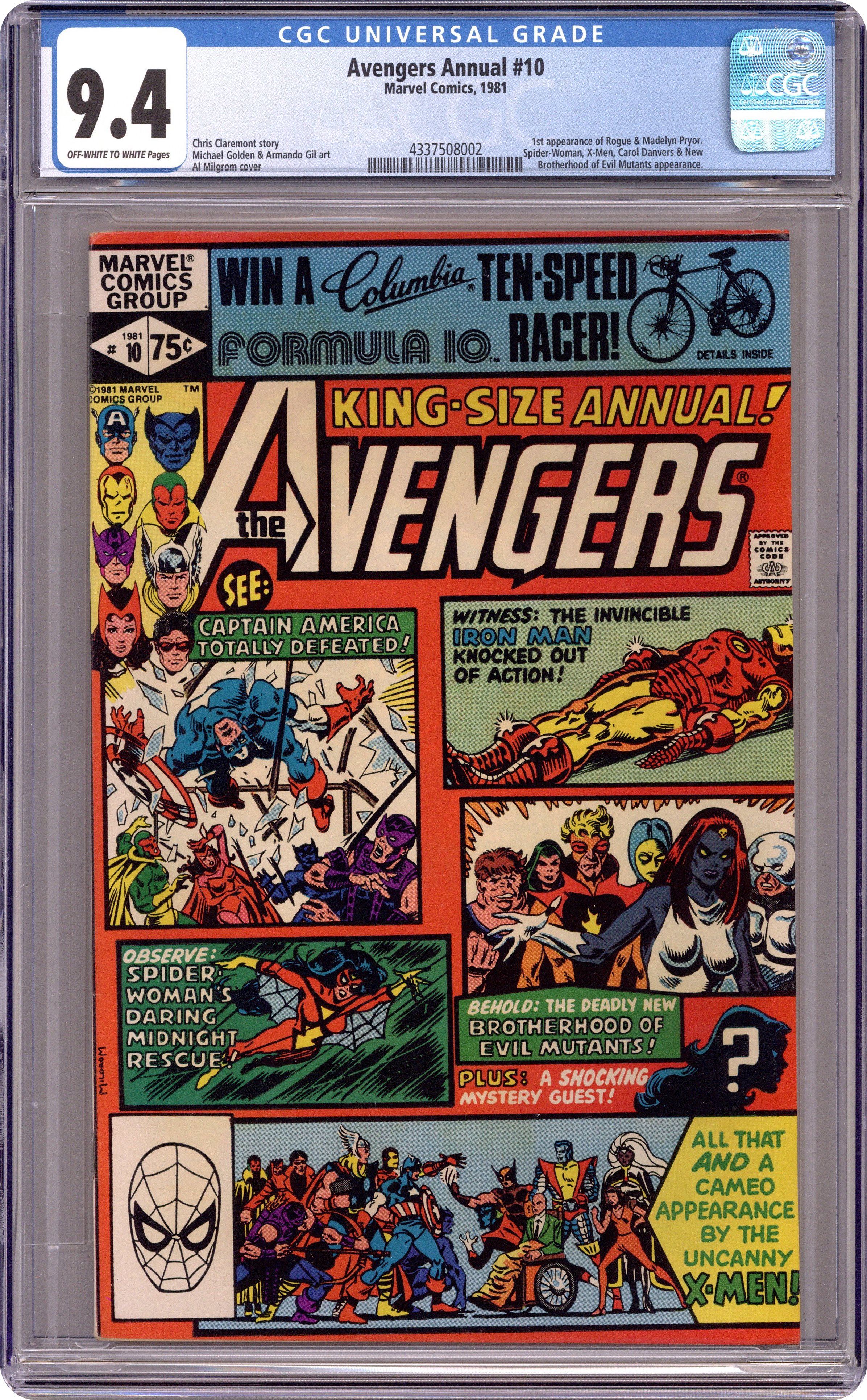 Ended Dec 11 2023 Winning Bid $96 Direct Edition. First appearance of Rogue and Madelyne Pryor in "By My Friends Betrayed!" Spider-Woman, X-Men, Carol Danvers, and New Brotherhood of Mutants guest star. Script by Chris Claremont. Pencils by Michael Golden. Inks by Armando Gil. Cover by Al Milgrom. This action-packed annual has got it all, true believers: the first appearance of Rogue, the spectacular art of Michael Golden, the tragic return of Carol Danvers, and the stupendous struggle between the Brotherhood of Evil Mutants and the mighty Avengers! Following the events of Uncanny X-Men #142, Mystique & her New Brotherhood of Evil Mutants attempt to break four of their members out of Ryker's Island prison! After Rogue and Mystique take down Captain America, Iron Man, and Thor, the rest of the Avengers and Spider-Woman catch up to the villains, and the epic clash erupts! Woven in and around the frantic action at Ryker's Island is the heartbreaking story of Carol Danvers' return to Earth. Her life has fallen apart since leaving for Limbo with Marcus Immortus in Avengers #200, and now, stripped of her powers and memories, Carol begins the long road to recovery. And the first step is an emotional confrontation with her former teammates! Notes: Marvel Super-Heroes #11 (Fall 1992) fills in the details of Carol Danvers' life between Avengers #200 and Avengers Annual #10. The Thing stars in a one-page Hostess ad, "A Lesson to Be Learned!" This issue was reprinted in 1993 in the trade paperback: The Greatest Battles of the Avengers. 52 pages, full color. Cover price $0.75. Grade: CGC 9.4 explanation of grade Condition: Used (collectible)