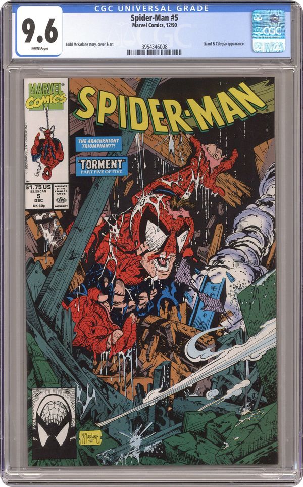 Direct Edition. Direct Edition. Torment Part 5 of 5. "Torment" Script and art by Todd McFarlane. Cover by Todd McFarlane. At the end of last issue, the former mansion of Kraven the Hunter exploded -- with the wall-crawler, the Lizard, and Calypso inside! Miraculously, Spider-Man survived, but so did the Lizard! And It's going to take all the inner strength and courage the web-slinger can muster -- to put the Lethal Lizard down for the count! Can your friendly neighborhood Spider-Man do it? A frantic finish! Appearance by Mary Jane Watson. (Note: The Lizard returns in Amazing Spider-Man 365.) 32 pages. Cover price $1.75. Grade: CGC 9.6 explanation of grade Condition: Used (collectible)