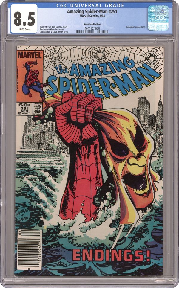 Ended Oct 15 2024 Winning Bid $21 Direct Edition. "Endings!" Part 3 of 3. Plot by Roger Stern. Script by Tom DeFalco. Art by Ron Frenz (breakdowns) and Klaus Janson (finishes). Cover by Ed Hannigan and Klaus Janson. After a pumpkin bomb sets his hideout ablaze, the furious Hobgoblin drives away in his battle van! But unbeknownst to the goblin, the web-slinger is holding on for dear life underneath! When Spider-Man crawls inside...the ferocious fight begins! As the Hobgoblin and the wall-crawler trade blows, the battle van careens into the Hudson River! Is the Hobgoblin going to sleep with the fishes? Only time will tell. Several hours later Spider-Man is drawn towards a mammoth citadel in Central Park...and then suddenly disappears! Cameo appearances by Harry Osborn, J. Jonah Jameson and Joe Robertson. (Notes: The Hobgoblin returns briefly in Amazing Spiderman 255. Tom DeFalco begins his 3-year run as the writer of the Amazing Spider-Man title. Likewise, Ron Frenz begins his 3-year run as the primary penciler. This issue includes a full-page ad for the first Marvel Super Heroes Secret Wars Limited Series (where the web-slinger appears next). This three-part story was reprinted in Marvel Tales 259, 260, and 261.)36 pgs. Cover price $0.60. Grade: CGC 8.5 explanation of grade Condition: Used (collectible)