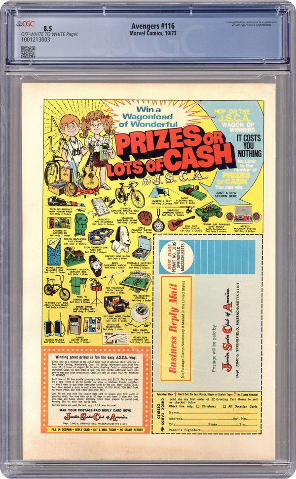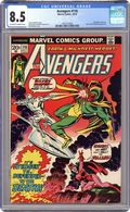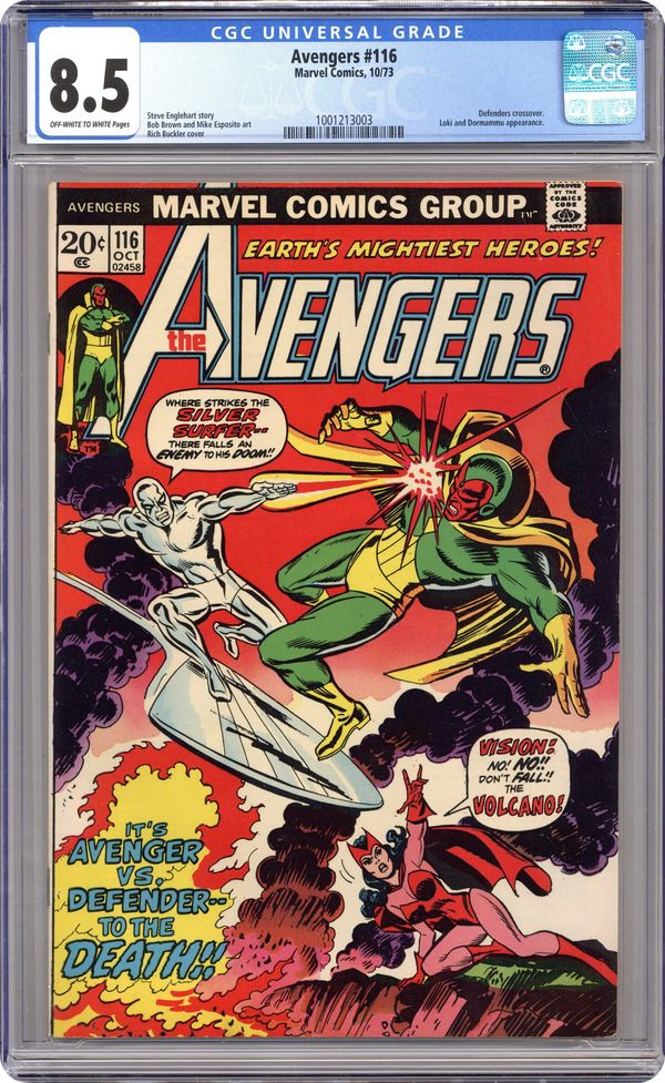 "Betrayal!" Avengers-Defenders crossover. Part 3 of 8. Guest-starring the Defenders. Script by Steve Englehart. Pencils by Bob Brown. Inks by Mike Esposito. Cover by John Romita and Mike Esposito. Story continues from Defenders 8. Earth's Mightiest Heroes visit Dr. Strange's townhouse in Greenwich Village and request permission to enter, but Wong slams the door in their faces! After an angry Thor breaks down the door, the Avengers storm inside, but a mystic spell sweeps them back out onto the street! Meanwhile gathered around the Orb of Agamotto, the Defenders put together a plan to find the six pieces of the Evil Eye. However, in the dark realm, Loki has grown suspicious of his dreadful ally! And contacts the Avengers to tell them about the Defenders' search for the ancient instrument from Avalon! So the die is cast! And the blockbuster battles are about to begin! Flashback cameos by Prester John, Wyatt Wingfoot, and the Human Torch to recap the history of the Evil Eye. Next Chapter: "The Silver Surfer vs. the Vision and the Scarlet Witch" The Avengers-Defenders Clash kicks into high gear as members of both teams span the globe to searching for the Evil Eye! And the first showdown features two of the most popular Marvel super-heroes of the 1970's! The Silver Surfer arrives in French Polynesia and plunges into the island's indigenous volcano to look for the Evil Eye. But the cosmic sky-rider's probing triggers a volcanic eruption! The fiery blast knocks a passing quinjet out of the sky and nearly kills the Scarlet Witch! Needless to say, this act enrages the synthezoid avenger! And in the heart of the raging volcano, the Vision and the Silver Surfer fight for the Evil Eye! Story continues in Defenders 9. (Notes: The Evil Eye previously appeared in Fantastic Four 54. This issue includes a full-page survey for readers to complete and mail back to the Marvel bullpen. A reprint edition exists for this issue.) 36 pgs. Cover price $0.20. Grade: CGC 8.5 explanation of grade Condition: Used (collectible)
