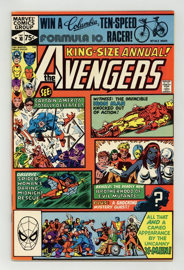 Ended Dec 26 2023 Winning Bid $61 Direct Edition. First appearance of Rogue and Madelyne Pryor in "By My Friends Betrayed!" Spider-Woman, X-Men, Carol Danvers, and New Brotherhood of Mutants guest star. Script by Chris Claremont. Pencils by Michael Golden. Inks by Armando Gil. Cover by Al Milgrom. This action-packed annual has got it all, true believers: the first appearance of Rogue, the spectacular art of Michael Golden, the tragic return of Carol Danvers, and the stupendous struggle between the Brotherhood of Evil Mutants and the mighty Avengers! Following the events of Uncanny X-Men #142, Mystique & her New Brotherhood of Evil Mutants attempt to break four of their members out of Ryker's Island prison! After Rogue and Mystique take down Captain America, Iron Man, and Thor, the rest of the Avengers and Spider-Woman catch up to the villains, and the epic clash erupts! Woven in and around the frantic action at Ryker's Island is the heartbreaking story of Carol Danvers' return to Earth. Her life has fallen apart since leaving for Limbo with Marcus Immortus in Avengers #200, and now, stripped of her powers and memories, Carol begins the long road to recovery. And the first step is an emotional confrontation with her former teammates! Notes: Marvel Super-Heroes #11 (Fall 1992) fills in the details of Carol Danvers' life between Avengers #200 and Avengers Annual #10. The Thing stars in a one-page Hostess ad, "A Lesson to Be Learned!" This issue was reprinted in 1993 in the trade paperback: The Greatest Battles of the Avengers. 52 pages, full color. Cover price $0.75. Grade: VF- 7.5 explanation of grade Condition: Used (collectible)