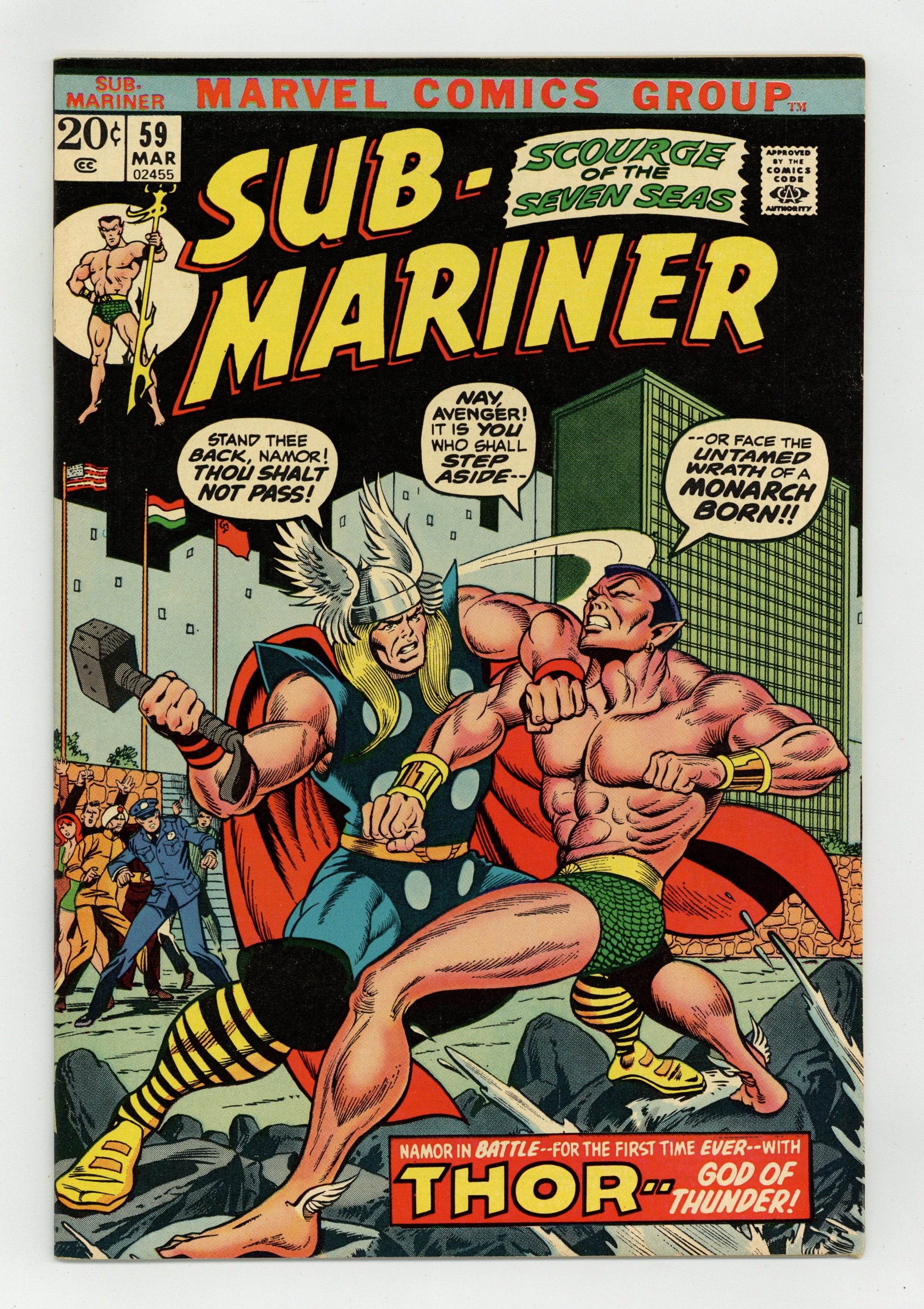 Ended Dec 12 2023 Winning Bid $29 Cover inks by Bill Everett and Marie Severin (alterations). "Thunder Over the Seas," script by Bill Everett and Steve Gerber, pencils by Sam Kweskin, inks by John Tartaglione; A pompous and arrogant Atlantean soldier, Lorvex, makes a pass at Tamara who rebukes his advances; She's later caught in a fishing net and eventually brought to New York city; Namor learns of her capture and makes his way there only to be challenged by Thor; Namor engages Thor and quickly learns the full power of the Thunder God; Namor returns home to ponder a full-scale invasion of the surface world. 36 pgs., full color. $0.20. Cover price $0.20. Grade: VF- 7.5 explanation of grade Condition: Used (collectible)
