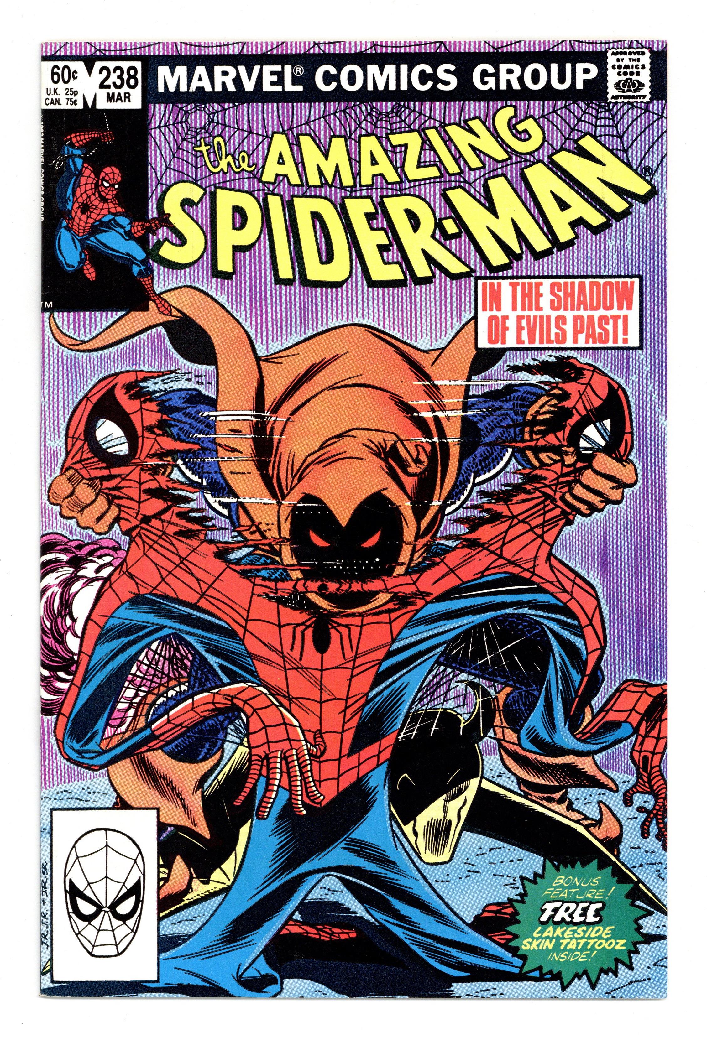 IMPORTANT: Issue 238A HAS the Lakeside Skin Tattooz insert. Direct Edition. First appearance of the Hobgoblin in "Shadow of Evils Past!" Script by Roger Stern. Art by John Romita Jr. (breakdowns) and John Romita Sr. (finishes). Cover by John Romita Jr. and John Romita Sr. One of the landmark issues of the Amazing Spider-Man! And the beginning of the long secret identity mystery of the Hobgoblin! After escaping from the web-slinger, a bank robber stumbles upon an underground hideout of the (deceased) Green Goblin! Not knowing what to do with his discovery, the small-time hood shows the secret lair to an underworld associate! Unfortunately for the wondrous wall-crawler, the devious associate knows exactly what to do: resurrect the Green Goblin...with a twist! And a short time later a new super-villain is born! The Hobgoblin! Cameo appearance by Mary Jane Watson. Flashback cameo by Norman Osborn (aka the Green Goblin). (Notes: The secret identity of the original Hobgoblin takes many twists and turns over the next decade. Who actually operates as the Hobgoblin in this issue is revealed in the Spider-Man: Hobgoblin Lives (1997) Limited Series (written by Roger Stern). This issue was reprinted in Marvel Tales 257 and also in the 1992 trade paperback: the Amazing Spider-Man -- Origin of the Hobgoblin.) 36 pages. Cover price $0.60. Grade: VF+ 8.5 explanation of grade Condition: Used (collectible)