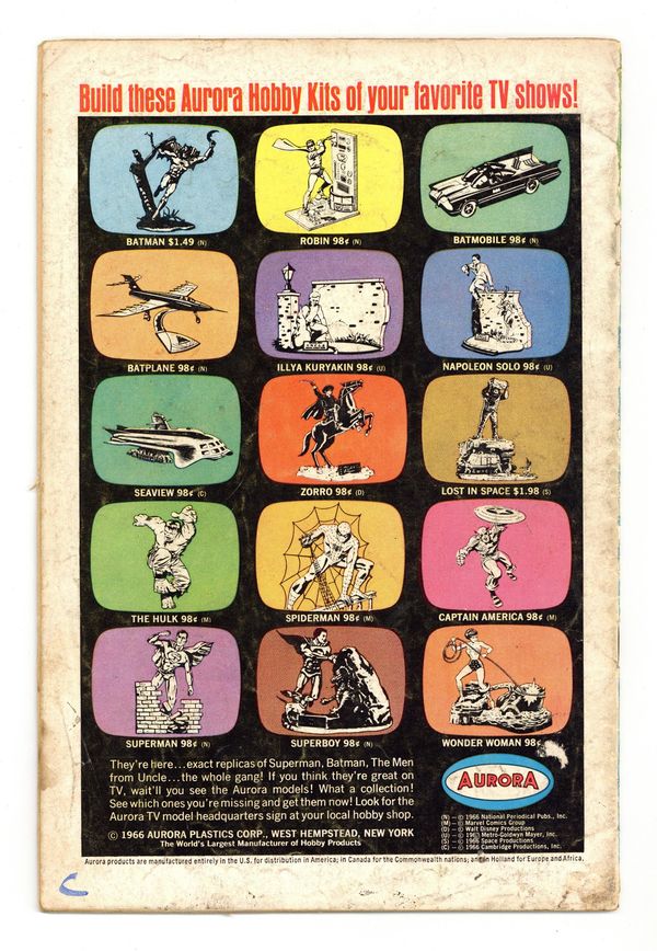 Cover pencils by Carmine Infantino, inks by Joe Giella. 1st Silver Age appearance of Scarecrow in book-length story, "Fright of the Scarecrow!", script by Gardner Fox, pencils by Sheldon Moldoff (as Bob Kane), inks by Joe Giella; While entertaining some children in the park, Dick happens to notice the Scarecrow retrieving buried loot from a past robbery; He calls in Batman and together they battle their old foe until they are blinded by Scarecrow's fear gas. Little Pete humor half-page by Henry Boltinoff. Letter from comic book writer Mark Evanier. Peace on Earth public service announcement. Eyes Front! humor half-page by Henry Boltinoff. 36 Pages, Full Color. Cover price $0.12. Grade: GD+ 2.5 explanation of grade Condition: Used (collectible)