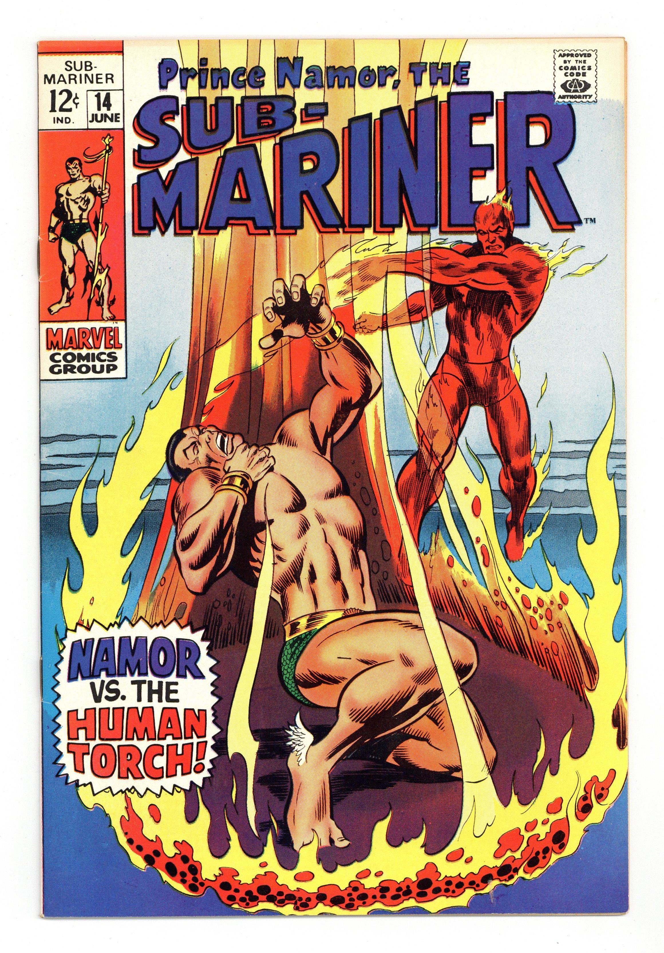 "Burn, Namor, Burn!" Written by Roy Thomas. Art by Marie Severin and Mike Esposito. Caught between the diabolical machinations of the mad Thinker and the Puppet Master, Prince Namor and the original Human Torch are forced to fight to the death! It's water vs. fire in the ultimate battle for the ages! Featuring cameos by the Avengers, Spider-Man, Nick Fury, the X-Men and the Thing. Includes pin-ups by Bill Everett, Jack Kirby, and Alan Weiss. 32 pages, FC. Cover price $0.12. Grade: VF- 7.5 explanation of grade Condition: Used (collectible)