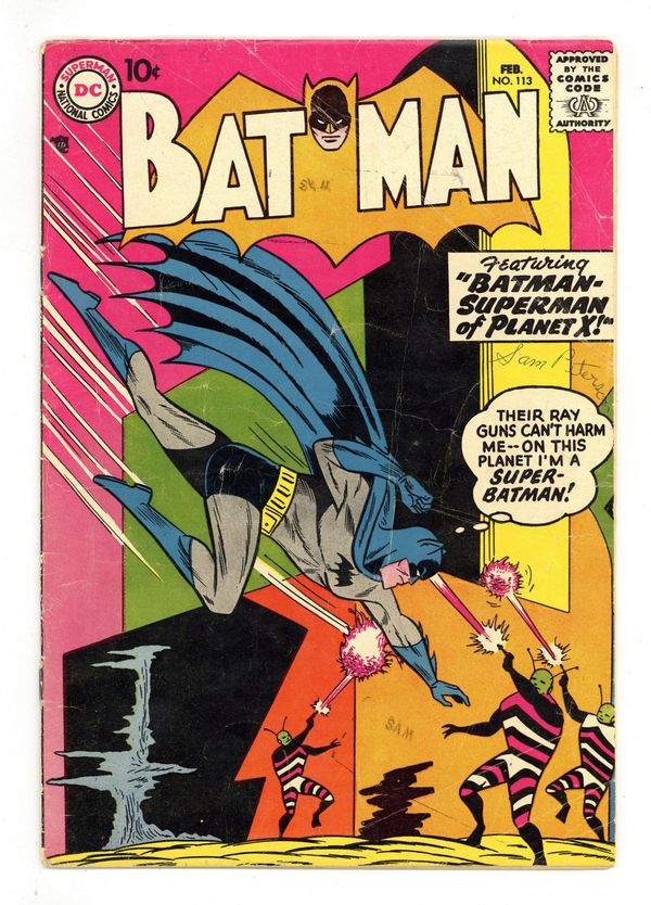Ended Jan 31 2024 Winning Bid $156 Cover by Sheldon Moldoff. "The Menace of False Face," pencils by Sheldon Moldoff (as Bob Kane), inks by Charles Paris; Batman discovers that False Face has impersonated a wealthy uranium tycoon named P.S. Smithington, and, as Smithington, he has robbed a local Gotham City jewelry store, framing the true Smithington for the crime. 2/3 Strange Laws! story, art by Morris Waldinger. One-page Casey the Cop story by Henry Boltinoff. "Batman Meets Fatman," script by Bill Finger, pencils by Sheldon Moldoff, inks by Charles Paris; A circus clown parodies Batman and is invited by the Caped Crusader to ride in the Batmobile, but when the Caped Crusaders are captured by a gang, it's Fatman to the rescue...with humor! The Flushing Remonstrance public service announcement, art by Bob Brown. Half-page History of Detective Mystery story, art by Morris Waldinger. The Elusive Clue article. "Batman--The Superman of Planet X!", script by France Herron, pencils by Dick Sprang (as Bob Kane), inks by Charles Paris; Batman is transported to the Planet Zur-En-Arrh and meets with the Batman of that planet in order to help him combat an enemy invasion force from another planet. One-page Fingerprint Curios story, art by Morris Waldinger. Half-page Warden Willis story by Henry Boltinoff. 36 Pages, Full Color. Cover price $0.10. Grade: GD+ 2.5 explanation of grade Condition: Used (collectible)