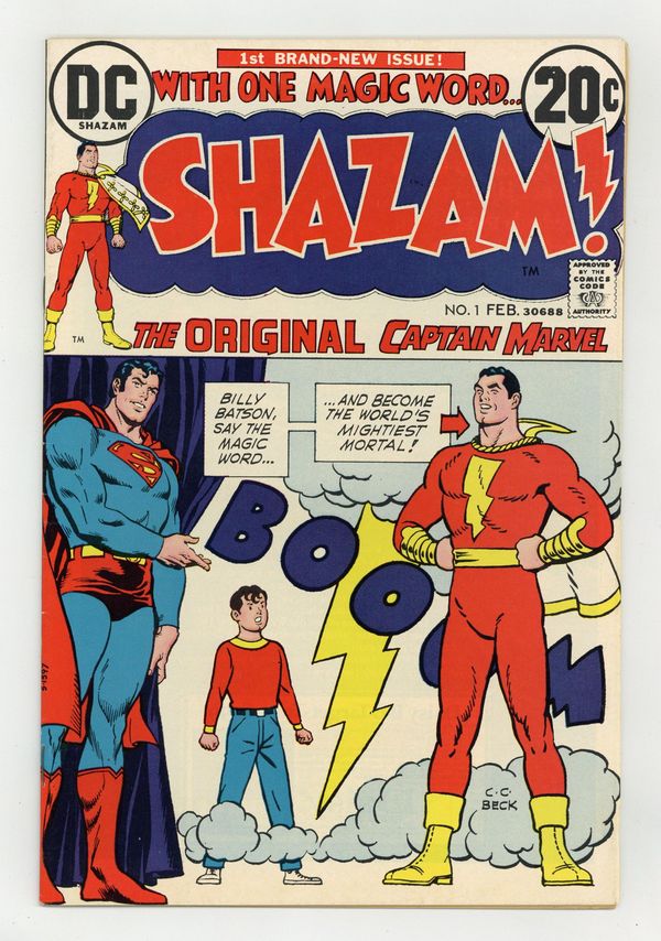 Cover by C. C. Beck, Nick Cardy, and Murphy Anderson. ...In the Beginning ..., script by Denny O'Neil, art by C. C. Beck; After missing for 20 years, Captain Marvel returns to Earth; Origin retold. The World's Wickedest Plan, script by Denny O'Neil, art by C. C. Beck; Captain Marvel escapes the trap that Dr. Sivana had created that caused the Marvel Family to be placed in suspended animation for the last 20 years. Reprint back-up: "The Endless String" (from Captain Marvel Adventures 55 in 1946), written by Otto Binder, art by Pete Costanza. One-page text feature by E. Nelson Bridwell--a history of Captain Marvel. 36 pgs., full color. $0.20. Cover price $0.20. Grade: VF- 7.5 explanation of grade Condition: Used (collectible)