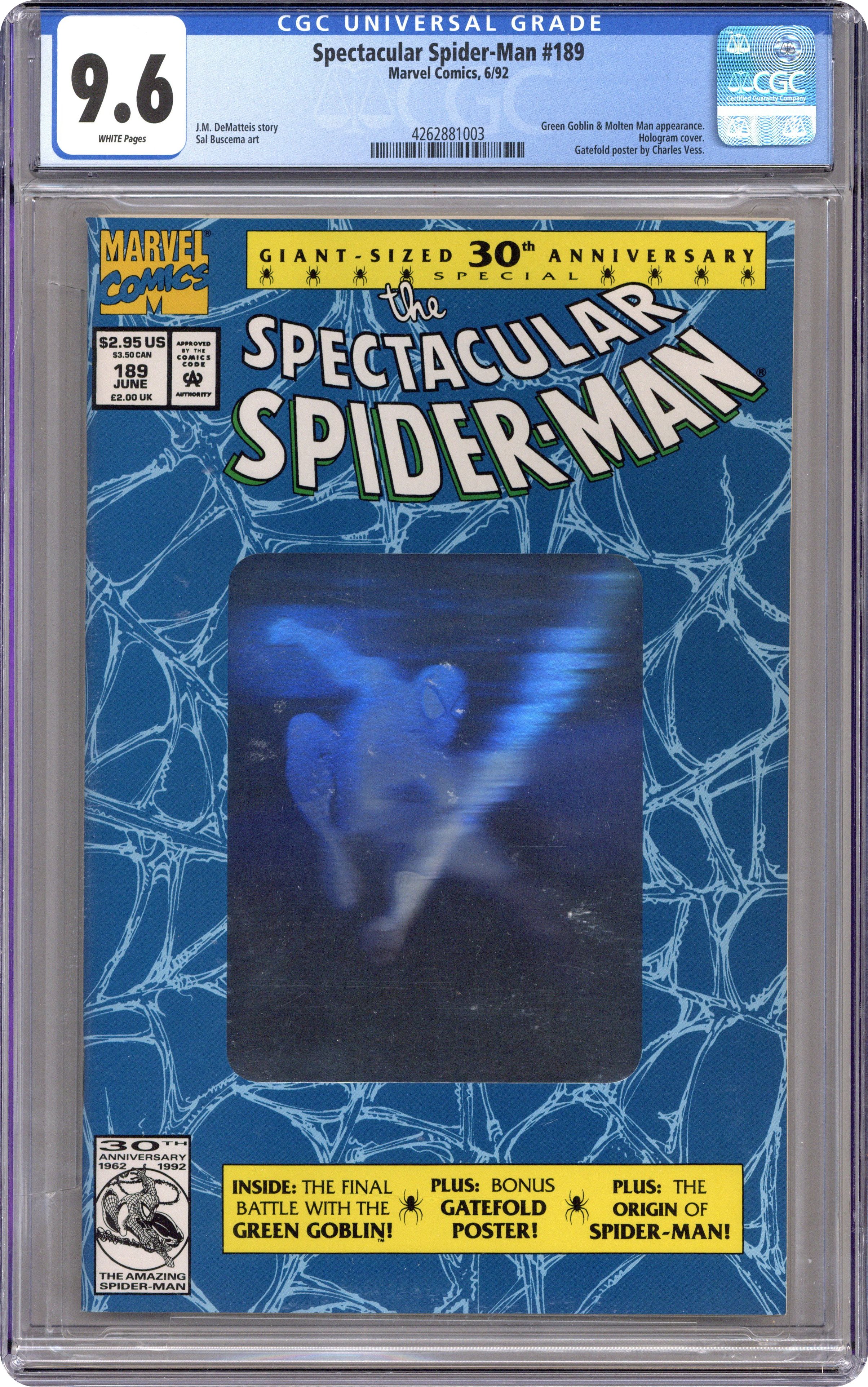 Direct Edition. The Osborn Legacy" First printing. Giant-Sized 30th Anniversary Special Issue. Silver hologram cover. Script by J.M. DeMatteis. Pencils and Inks by Sal Buscema. Harry Osborn has battled psychological problems his entire adult life, but this time hes really gone off the deep end! The Green Goblin kidnaps his wife, son, and brother-in-law (aka the Molten Man) and takes the trio to his fathers old house in the suburbs. For the first time Harry wears the goblin costume in front of his young son. However, Normie doesnt seems to understand the gravity or depravity of the situation and enjoys his fathers ranting and raving while the family sits down for dinner! Fortunately, the goblins diatribe buys the web-slinger time to track down his green and purple foe! And with help from the Molten Man, the Amazing Spider-Man battles the Green Goblin one more time! Second Story: The Night the World Died Script by J.M. DeMatteis. Pencils and Inks by Bob McLeod. Aunt May still has nightmares about the night her husband, Ben Parker, was killed. But her recent encounter with Spider-Man (during the ordeal with the Vulture) has surprisingly brought her comfort. (Notes: This issue includes a fold out poster by Charles Vess featuring Spider-Man and the Hobgoblin. The second printing has a gold hologram cover and was published in November 1992.) 48 pages Cover price $2.95. Grade: CGC 9.6 explanation of grade Condition: Used (collectible)
