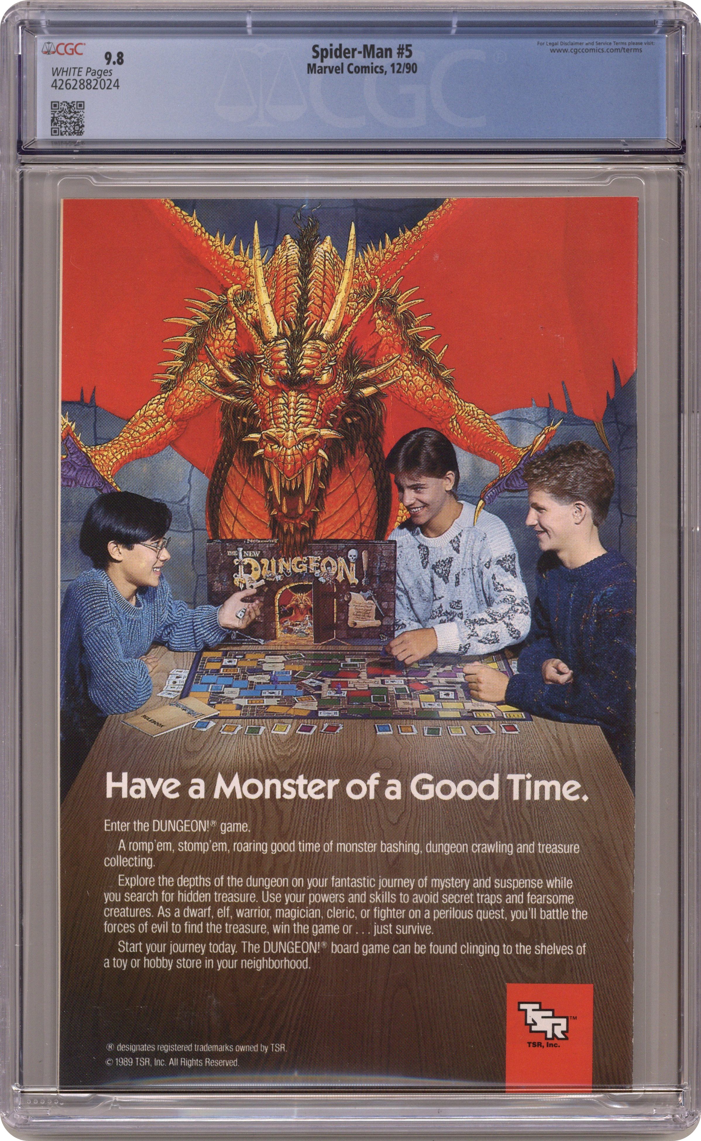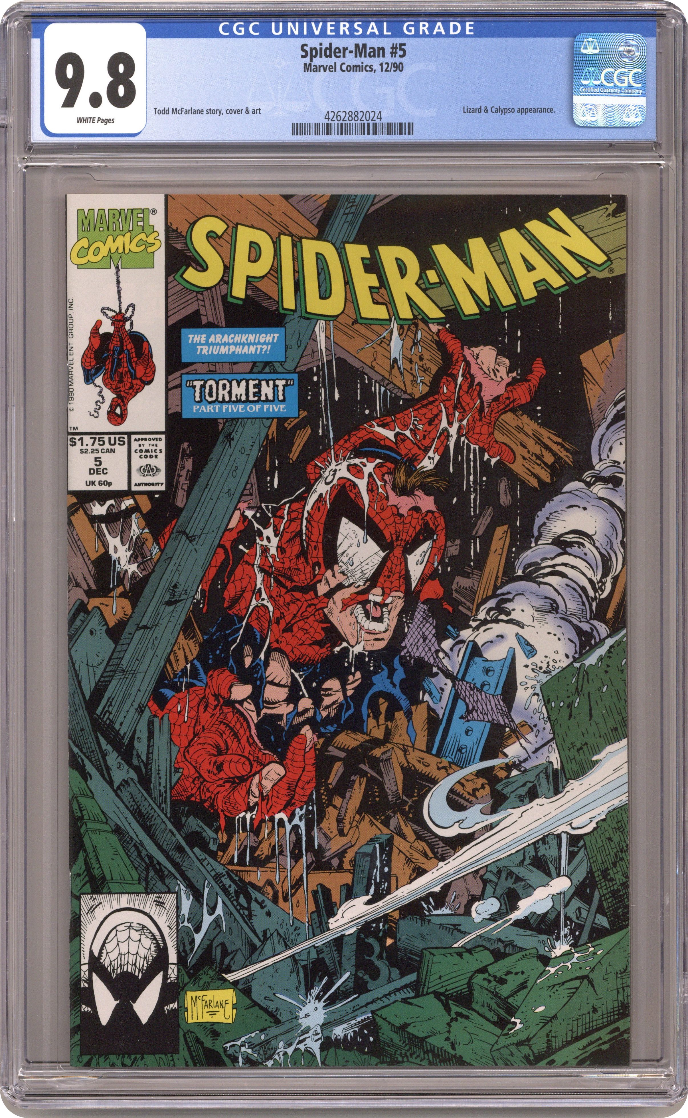 Direct Edition. Direct Edition. Torment Part 5 of 5. "Torment" Script and art by Todd McFarlane. Cover by Todd McFarlane. At the end of last issue, the former mansion of Kraven the Hunter exploded -- with the wall-crawler, the Lizard, and Calypso inside! Miraculously, Spider-Man survived, but so did the Lizard! And It's going to take all the inner strength and courage the web-slinger can muster -- to put the Lethal Lizard down for the count! Can your friendly neighborhood Spider-Man do it? A frantic finish! Appearance by Mary Jane Watson. (Note: The Lizard returns in Amazing Spider-Man 365.) 32 pages. Cover price $1.75. Grade: CGC 9.8 explanation of grade Condition: Used (collectible)