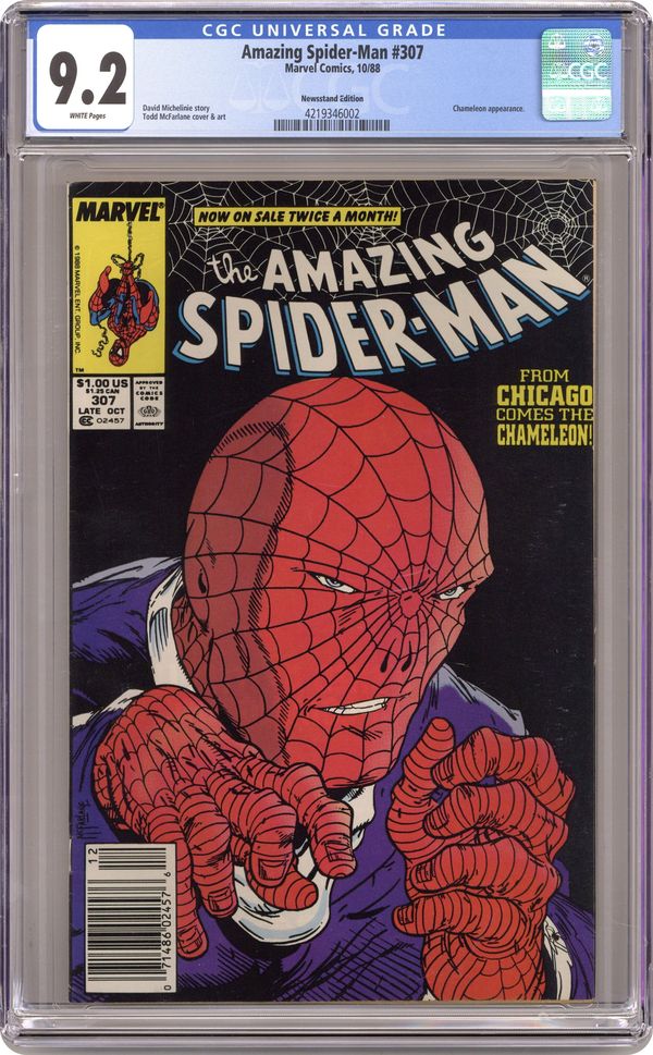 Ended Dec 19 2023 Winning Bid $27 Direct Edition. "The Thief Who Stole Himself!" Script by David Michelinie. Art by Todd McFarlane. Cover by Todd McFarlane. Peter Parker's next stop on his book signing tour is the Windy City! This should be a quick and easy trip to Chicago for the web-slinger! However an old foe from long, long ago elects to embark on a new criminal career in the second city! Can the amazing one capture the Chameleon before his next endeavor begins? Spidey will have to spot him first! In the meantime back in Manhattan, the deranged Jonathan Caesar makes his move on Mary Jane! Hurry home Spider-Man! (Note: The Chameleon previously battled the wall-crawler in Amazing Spider-Man 186.) 36 pages. Cover price $1.00. Grade: CGC 9.2 explanation of grade Condition: Used (collectible)